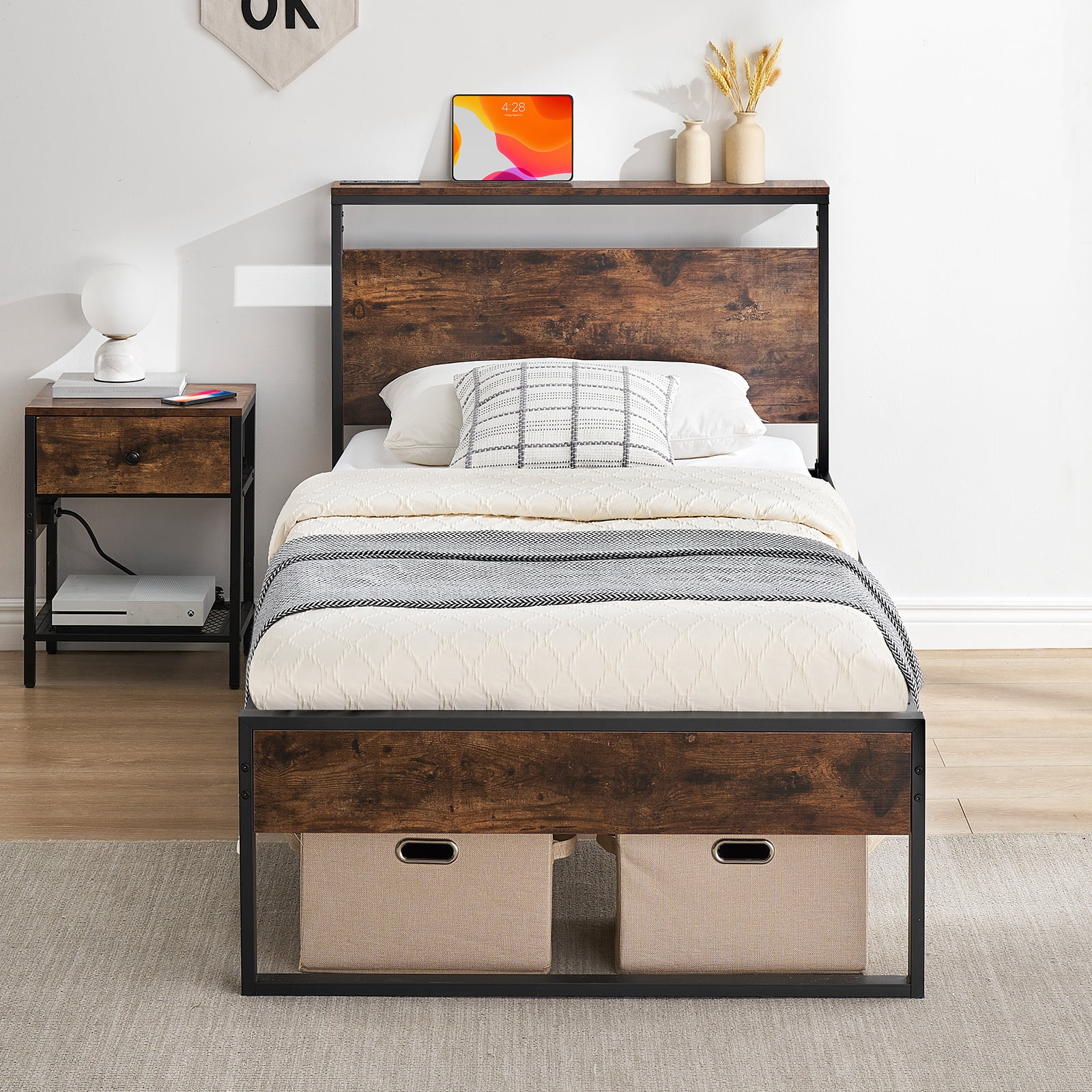 Behost 14″ Twin Bed Frame with Headboard , Power Outlets Platform Beds for Bedroom, Rustic Brwon