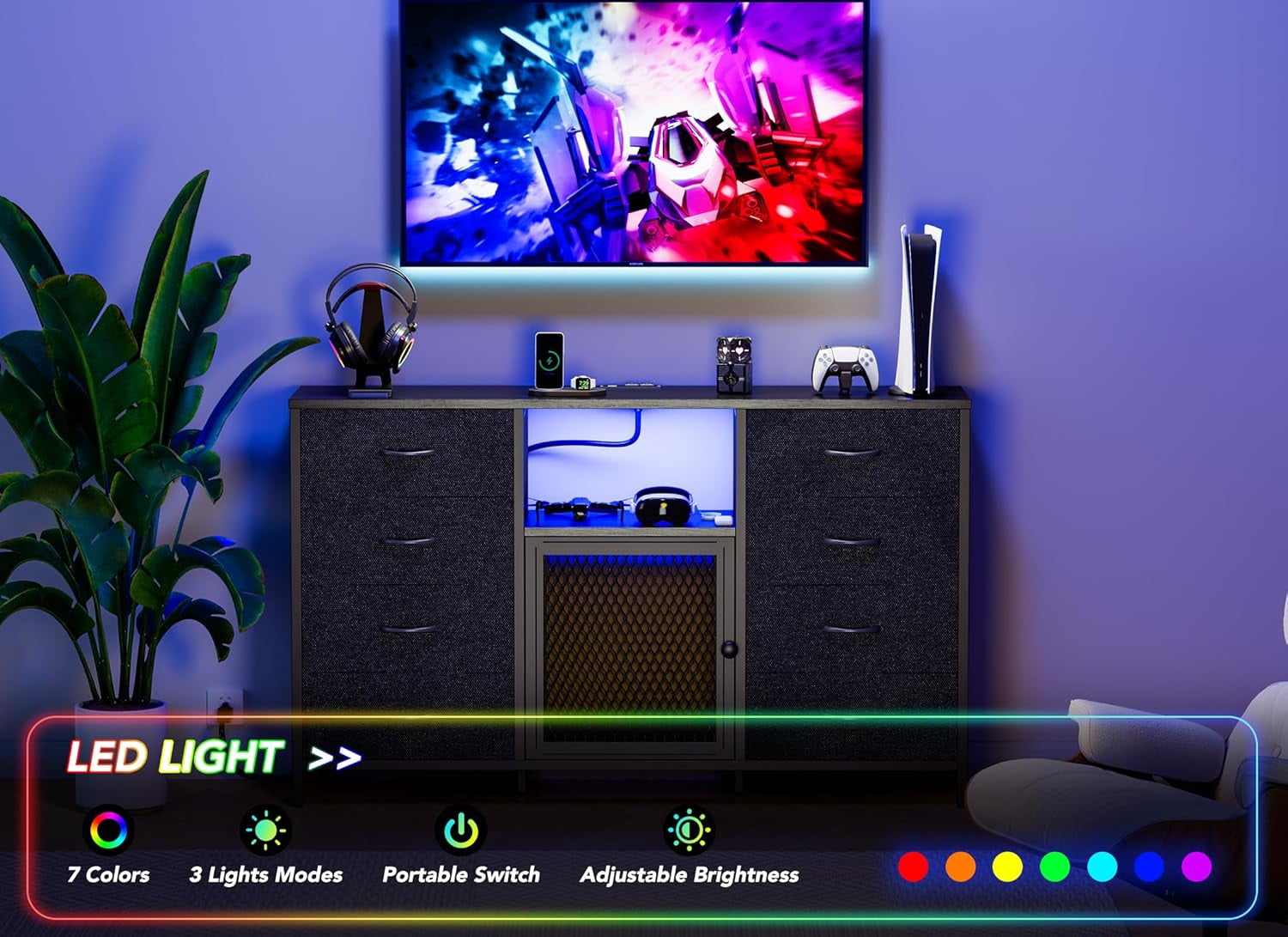 $85.99Osoeri Black Dressing Table-Storage Shelf-TV Cabinet-Shoe Cabinet 【8 Drawers Dresser】Black dressers for bedroom dimensions:51.96″ L x 11.4″ W x 31.5″ H. Top wooden open storage shelves have a weight capacity of 220 pounds, not only can it be used as a TV stand (up to 65 inches), but it can also be used to hold TV accessories, books, cosmetics, and other items. 8 Big drawer size: 16″ (L) x 11″ (W) x 6.5″ (H). Each can hold up to 8 lbs and is perfect for sorting and organizing your clothes, blankets, scarves, socks, and more 【Charging Station and LED Lights】This fabric dresser for the bedroom has a charging station and LED lights. 2 USB ports and 2 AC outlets, which can fully charge your lamp, mobile phone, and iPad simultaneously without additional extension cords. Meanwhile, you can freely set the color, brightness, and mode of the LED light strip by buttons, making the long drawers feature a great addition to your bedroom. 【More Stable and Safer】 LED Dresser with adjustable feet and Anti-tipping device, 6 adjustable feet on the bottom can balance on uneven floors and protect the floor from scratches, and it is also adaptable to different spaces. Anti-tipping device, locks the dresser and the wall tightly, improves the weight bearing and stability of the living room TV dresser, perfect for home use.This reflects our emphasis on safety, especially for kids. 【Multi-Scene Application】The wide dresser for bedroom features a sturdy metal frame and 15mm thick wooden top for durability. The space-saving black 8-drawer design blends in perfectly with most furniture. It can be a storage cabinet/nightstand in the bedroom or a side table in the living room, and is also perfect for closets, nurseries, entryways, hallways, offices, playrooms, kids dressers for bedroom, etc 【Easy to Assemble】The packages will come with all the tools and accessories for quick assembly, which allows only about 30 minutes to assemble your storage drawers with detailed instructions. This black dressers for bedroom with 8 drawers is the perfect housewarming gift for family and friends.