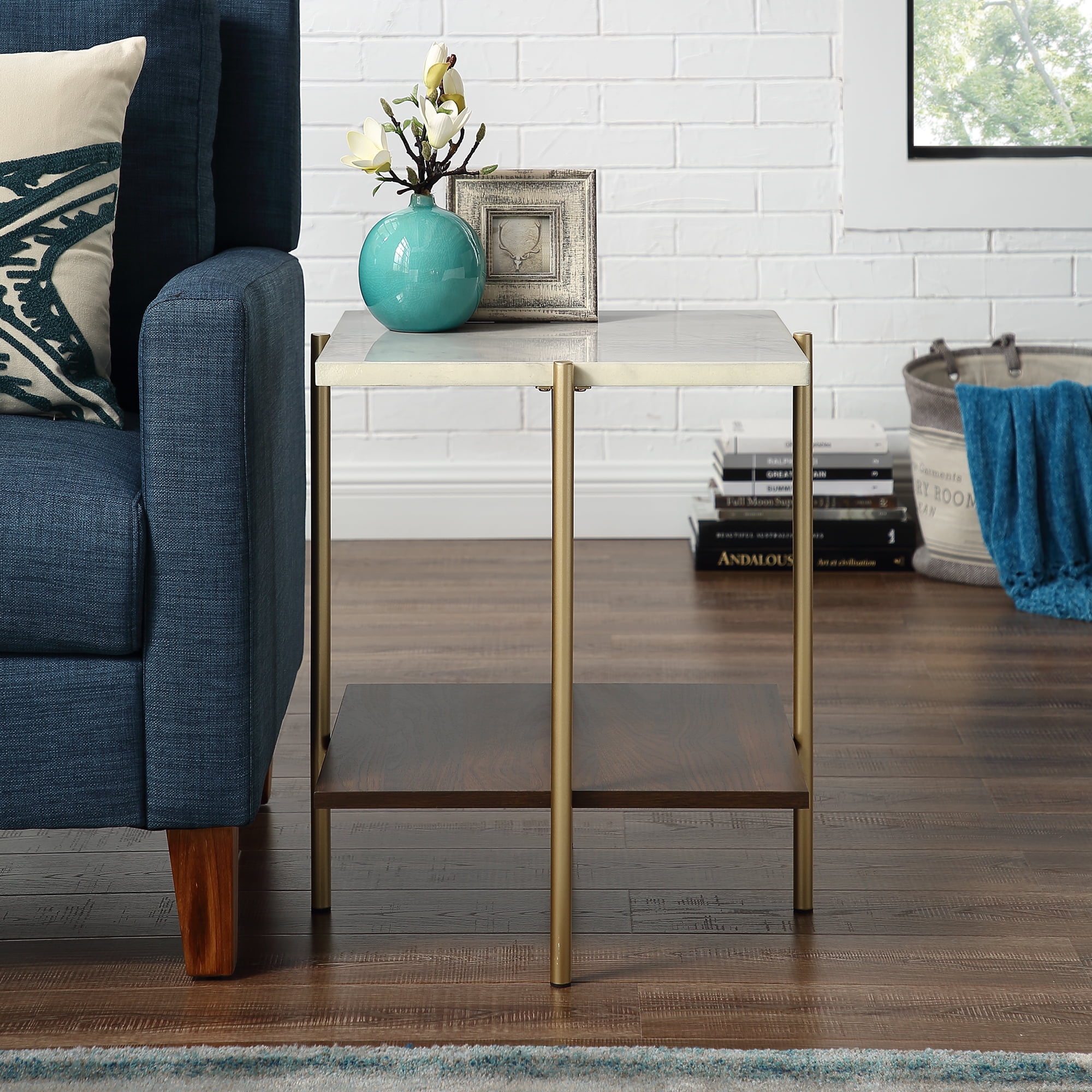 $91.69As classy as a first lady, the Jackie Multitone End Table by Bellamy Studios will be an unforgettable addition to your home. Its slick silhouette makes it a standout side table. It features a faux white marble table top that’s finished with a UV coating. The UV coating creates a high gloss look and provides a moisture resistant layer so go ahead and plan your next cocktail party without worrying about setting out any coasters. Painted gold metal legs frame the accent table. The lower shelf is finished with a dark walnut high-quality laminate that offers additional richness to this square side table.