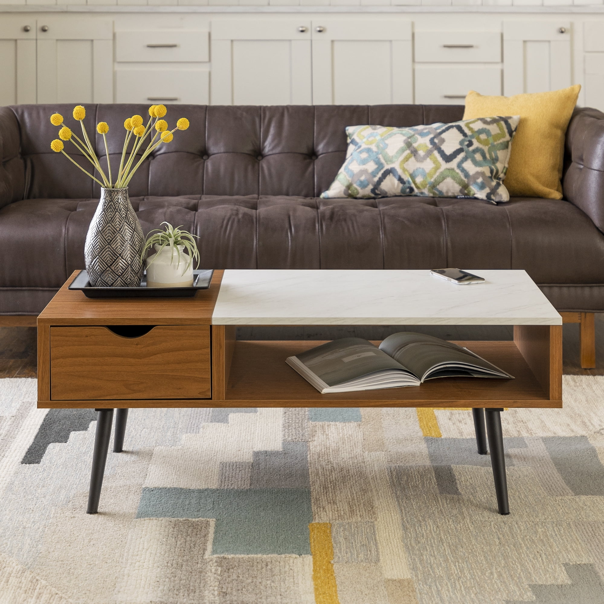 $92.91Incorporate the Booker Single-Drawer Acorn and Faux Marble Coffee Table by Bellamy Studios into your living room to hit the right notes of style and function. Sleek metal tapered legs create the base of this mid-century-inspired accent table. Each leg also includes rubber feet so you don’t have to worry about your floors. Choose from either tempered glass or a faux white marble tabletop for this small space-friendly cocktail table that’s great to entertain around. This mixed-material rectangular coffee table has both open and closed storage. There is one fully finished drawer that is only accessible from one side and there is also a cubby that’s open to both sides where you can tuck away games, remotes, or the book you’re reading.