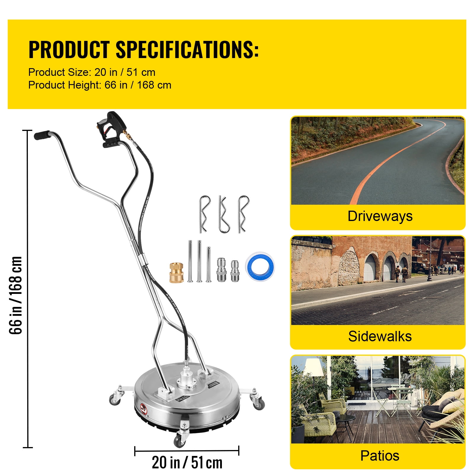 $247.63Product Description Pressure Surface Cleaner Large Cleaning Area & Max.4000PSI Pressure & User Friendly Details 20″ Wide Cleaning Area Our pressure washer surface cleaner is perfect for cleaning up stubborn debris on the ground. 4000 PSI working pressure provides a fast cleaning. 2 High-efficient Nozzles The flat surface cleaner has fast-rotating jets with a 25-degree spray angle to achieve a better cleaning effect. Max. water flow at 8.5 GPM. 304 Stainless Steel The surface washer is made of robust stainless steel material that can be used for a long time without corrosion, deformation, or damage. Our Advantages The 180-degree adjustable handle, 4 universal castors, and stiff bristles all help you effortlessly operate the pressure washer floor scrubber. Fit for 3/8″ Connector For your quick installation, you should use a 3/8” quick connector to connect the water hose—different modes on the trigger gun are provided for convenient use. Wide Application The pressure washer floor cleaner can be used anywhere. Ideal for cleaning garage floors, driveways, sidewalk, cement patio, etc. Specifications Model: VV-SWC-20 Material: 304 Stainless Steel Cleaning Surface Area: 20 in/ 51 cm Max. Working Pressure: 4000 PSI Max. Flow: 8.5 GPM Min. Working Pressure: 800 PSI Min. Flow: 2 GPM Inlet: 3/8 in QC Female Plug Outlet: 25-degree Nozzles Max. Water Temperature: 140°F/ 60°C Package Content 1 x Surface Cleaner 2 x 1/4” Quick Connector 1 x Hose 1 x Trigger 1 x User Manual