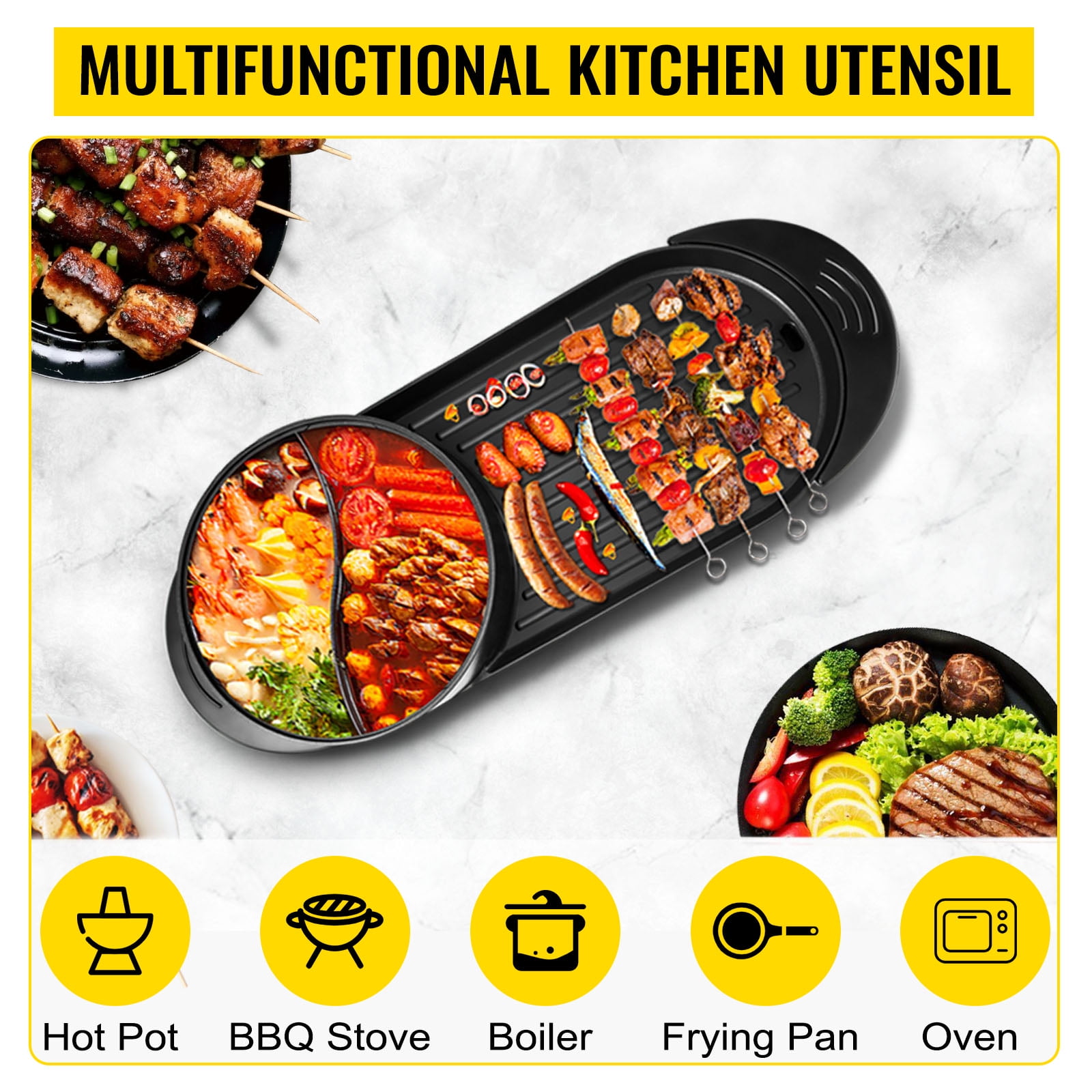 $57.96Brand Introduction VEVOR is a leading brand that specializes in equipment and tools. Along with thousands of motivated employees,VEVOR is dedicated to providing our customers with tough equipment & tools at incredibly low prices. Today, VEVOR has occupied markets of more than 200 countries with 10 million plus global members. Why Choose VEVOR? 1.Tough Quality Assurance 2.Incredibly Low Prices 3.Fast & Secure Delivery 4.30-Day Free Returns 5.24/7 Professional Customer Service Product Description BBQ Pan Grill Hot Pot The 2-in-1 Indoor Grill is the hero of home cooking. Grill sizzling steaks, delicious hot pot, or sear vegetable can be finished in one compact countertop appliance. Bring outdoor flavors inside with its ridged grill surface that achieves excellent grilled flavor and beautiful grill marks with ease. The deep cooking pot with a tempered glass lid allows for simmering delicious pot roasts, chili, fondues, soups, and more. Then, with just a turn of the knob, feast on the versatile and durable grill hot pot. Multifunctional Kitchen Utensil This innovative design allows you and your friends to enjoy Korean barbecue while having a hotpot, bringing diversity to your table at a party. At the same time, with this 2 in 1 grill and hot pot, you and your family can enjoy delicious meals of various kinds of food, like steaks, shrimps, burgers, veggies. Quality Construction Non-stick coating, thickened aluminum, durable tempered glass, stainless steel bottom, and insulated handle design offers a smokeless superior product use experience. The high-quality material can extend the service life. So you can enjoy the hotpot and BBQ with comfort. Select Your Speed Hot pot and bbq grill have independent temperature control so that you can use the barbecue and hot pot areas separately. With a 5-speed temperature adjustment, it is easy to reduce or increase the heat according to your different needs. For example, when the temperature is up to 428℉, it will auto shut off, and when the temperature is lower than 320℉, it will auto turn on. 2200W High Efficiency Equipped with 2200W power, this electric stove indoor hot pot is powerful and practical. Fast and even heating technology enables you to enjoy food in a short time. The biggest power for a hot pot is 1200W, and the grill is 1000W. Large Capacity Product dimension: 26.4 x 11 x 6.7 inches; this pot hot and grill provide an enormous capacity to put various foods and enable 2~8 people to enjoy together. Oil Leakage Port Automatic oil leakage design, the frying pan oil is automatically dropped to the bottom, which will reduce the smoke and making it effortless to clean. Specifications Model: PC-8002 Material: Aluminum + Stainless Steel + Tempered Glass Speed: 5 Speeds Power: 2200W Temperature Range: 320℉-428℉/ 160℃-220℃ Item Dimension: 26.4 x 11 x 6.7 inch/ 67 x 28 x 17 cm Weight: 8.8 lbs/ 4 kg Voltage: 110V