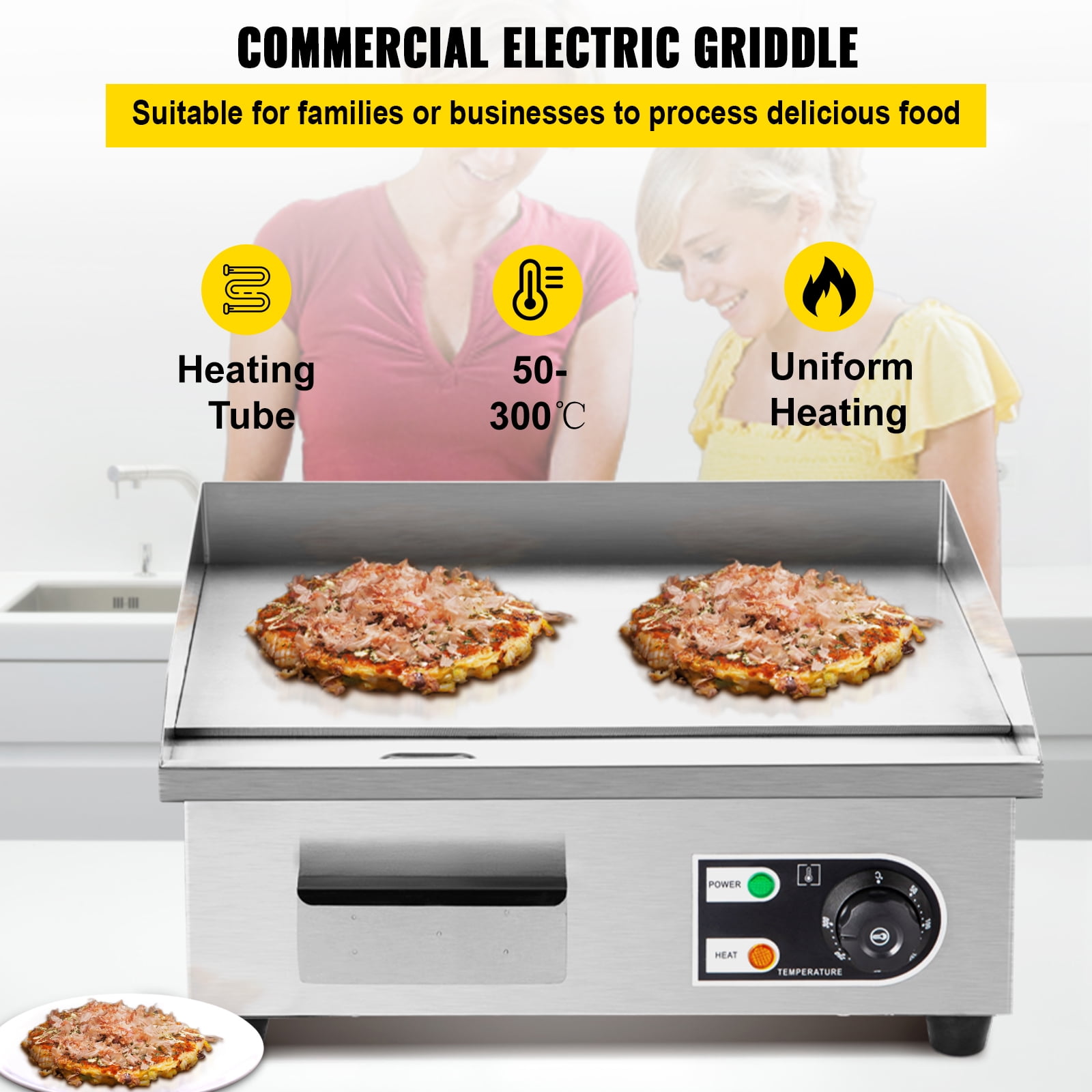$85.99Original price was: $85.99.$70.51Current price is: $70.51.Product Description Electric Grill This countertop griddle is perfect for cooking vegetables, meat, steak, squid, grilled cheese, pancakes, scrambled eggs, etc. Smooth knob control allows you to adjust the temperature of the griddle to cook different raw materials. Easy operation, great for both home and commercial use. Sufficient Cooking Area 14.2″ x 11.8″ (360 x 300 mm) large size flat cooking surface. 0.3″ (8 mm) steel board heats fast and even. Precise Temp. Control Smooth knob for easy control. Temperature ranges from 122~572 ℉ (50~300℃) with LED light showing heating status. Convenient Cleaning Large oil spill allows for collecting oil and drain to a drawer below, which is easy taken off for cleaning. Even Heating With dense heating coils, foods are able to be cooked evenly and thoroughly compared with sparse coils. Multiple Cooling Holes Multiple vents on both sides effectively dissipate heat and help machine to maintain reasonable temperature. Wide Application Perfect for cooking vegetables, meat, steak, squid, grilled cheese, pancakes, scrambled eggs, etc. Specifications Power: 1500W Voltage:110V Frequency:50Hz-60Hz Plug (Yes / No):YES Body Material: 410 Stainless steel Cooking Plate Material: Cast Iron Temperature Control Range: 122°F-572°F (50°C-300°C) Over-Heating Protection:NO Oil Splashing Protection:extra 2″ ( 70mm ) high splash guards on 3 sides protecting Emovable Grease Tray:YES Cooking Plate Dimension: 14.2″ x 11.8″ ( 358×350MM ) Cooking Plate Thickness: 0.3″ (8 mm) Power Cord Length: 59″ (1500 mm) Overall Dimension (with Feet):14.1″ x15.3″x8.7″ ( 360×390×220MM ) Net Weight:11KG (24.3 lbs) Package Content 1 x Electric Countertop Griddle 2 x Spatulas 2 x Brushes