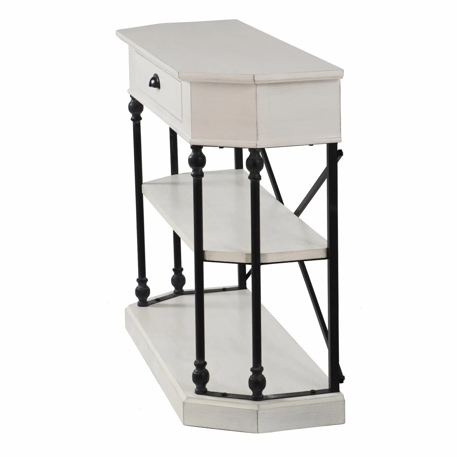 3 Tier Single Drawer Clipped Corner Console Table – Black Metal Frame – Antique White Finish