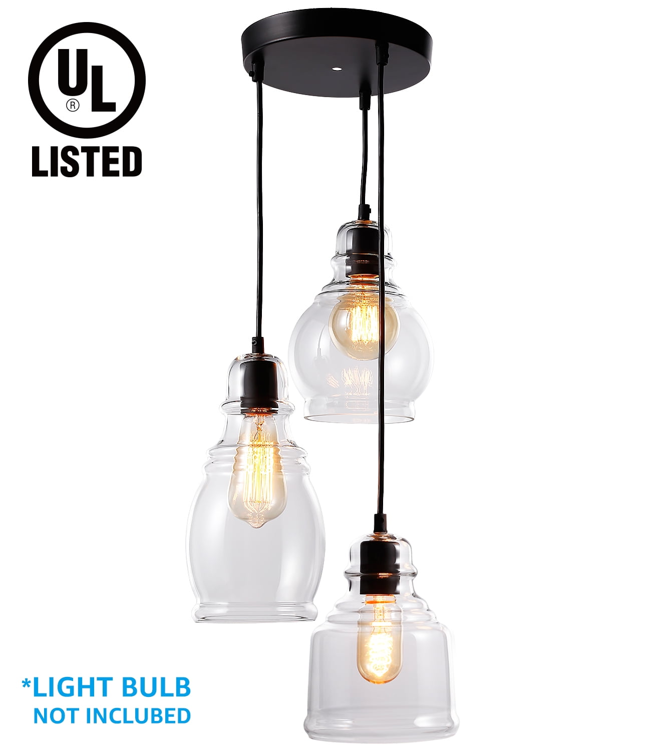 3-Light Pendant Ceiling Light, E26 Base, Vintage Clear Glass Shades Pendant Lighting, for Dinning Room, Classic Kitchen, Living Room