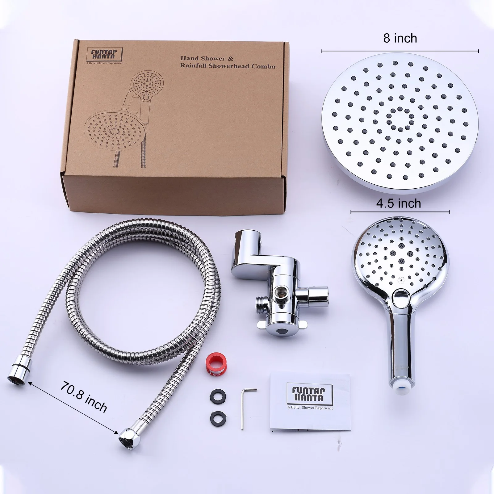 3-Setting Shower Head, 8-inch Large Round Rain Head Handheld, 3-Way 70.8-inch Tangle-Proof Hose, ABS