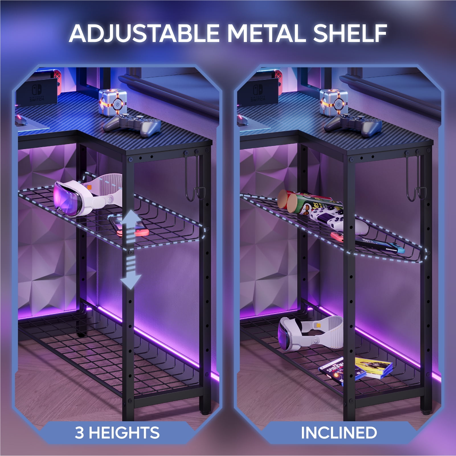 $240.79Original price was: $240.79.$171.99Current price is: $171.99.This Bestier 70 inch Large LED L shaped desk is an optimal choice for your gaming or office. It comes with an RGB light strip with 7 colors and 22 modes to choose from, and you can switch the color of the light strip via a wireless remote control, the colorful light can make you more immersed in the gaming world. It can accommodate 3 monitors and 1 laptop, the desk has built-in 4 AC outlets and 2 USB ports that can power up to 6 devices at the same time, you don’t need to worry about finding outlets anymore. The corner desk comes with a hutch on the top, which provides display and storage space for your toys, photos and other ornaments, and the metal hook for headphones, bags or keys to save desktop space. This long table comes with 19.3″ x 19.7″ open shelves for large devices such as printers and PS5, and the metal shelf on the left side can be adjusted up and down, or its tilt angle can be adjusted to accommodate items of different sizes. The high quality materials ensure that this gaming table will stand the test of time, and you can count on it to be a favorite for years to come.