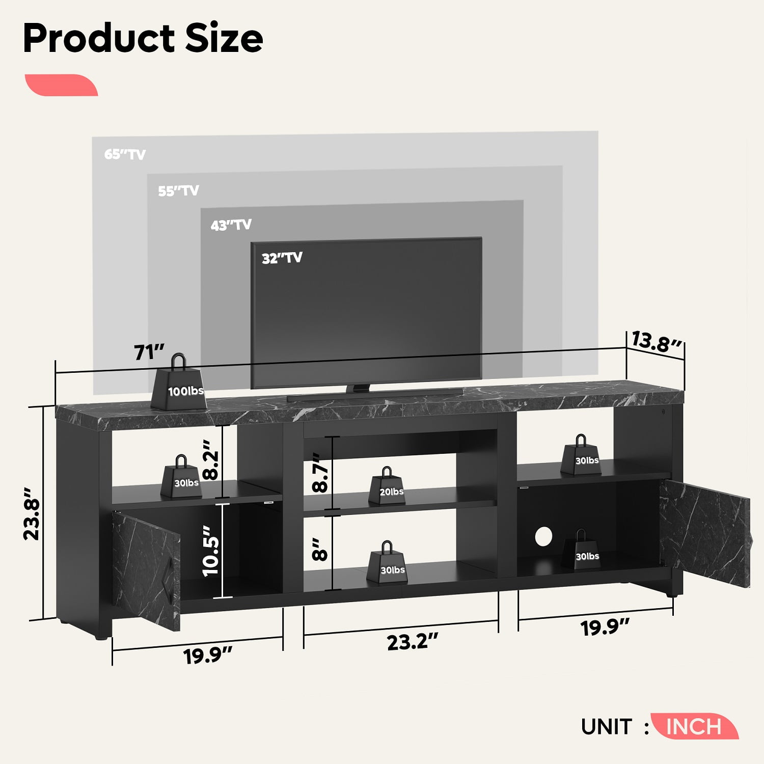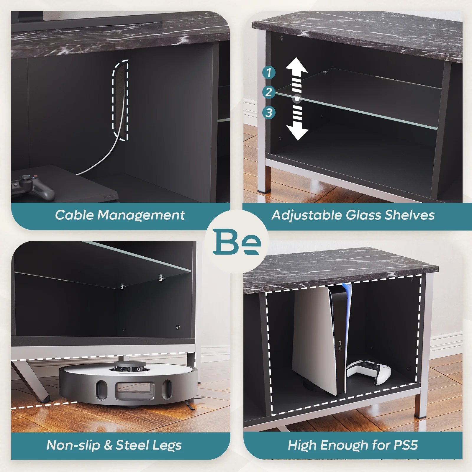 $137.59Original price was: $137.59.$123.83Current price is: $123.83.Installation Video Bestier 70 inch TV stand features delicate and durable black marble finish,which is a stylish addition to any modern entertainment setup. It offers ample storage with four open shelves and two cabinets for your media equipment and DVDs.The middle shelves can be placed or disassembled according to your needs, and PS5 can be placed in the middle after the shelf is disassembled. The LED light with 7 main colors and 22 dynamic modes to create a beautiful ambiance that enhances your living room, bedroom or game room. You can adjust the lights of different colors according to different preferences. Holes in the back panel manage cord routing to prevent tangles.The 23.8″ height design makes it easier for you to take things, at the same time adapts to the height of the TV, giving you a better viewing experience. Suit for most TVs, such as LCD, Flat, 3D, LED TVs etc. Big enough to support any style of 55, 65, 75, 80-inch TV.