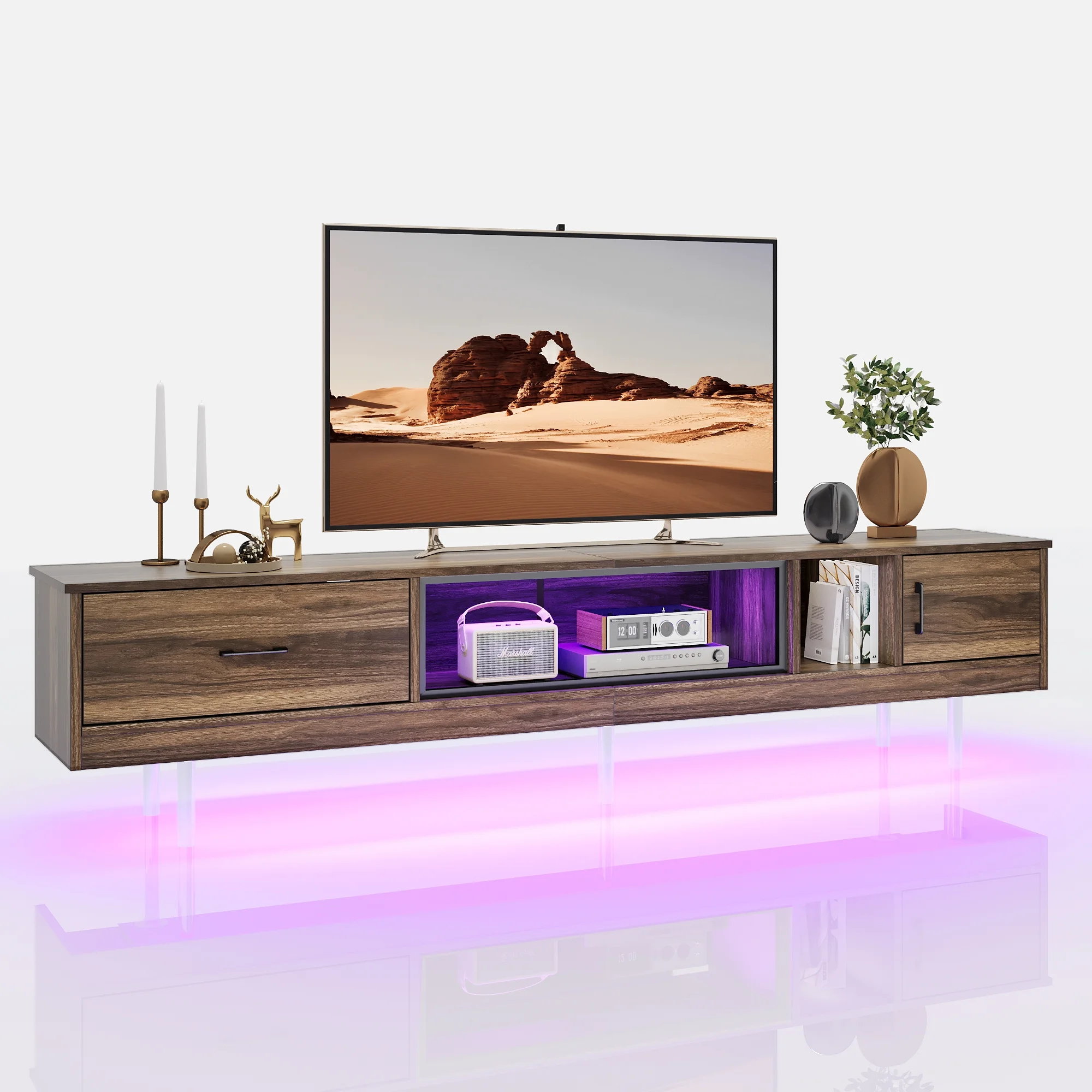 $206.39Original price was: $206.39.$163.39Current price is: $163.39.The Bestier 80-inch TV stand is a sleek, modern piece that elevates any room. It’s set on clear feet for a unique look and has two LED lights for a great TV-watching ambiance. With a drawer, cabinet, and open shelf, it offers plenty of storage for your devices and decorations. It’s not just stylish but also sturdy, built to last in your home. This stand perfectly blends elegance, practicality, and durability.