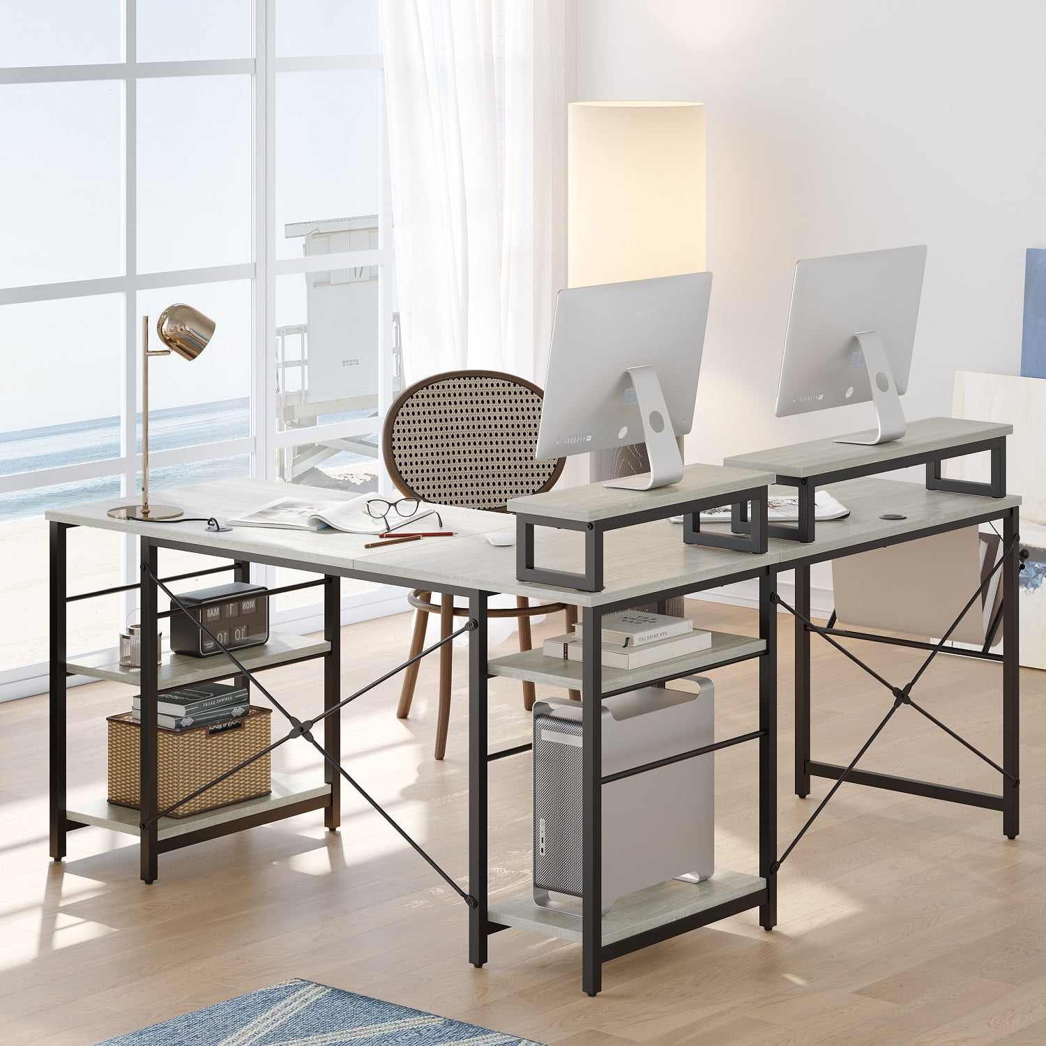 $94.59This reversible grey L-Shaped computer desk is designed for multi-purpose, well fitted in the office for work, playroom for computer games, living room for family use, and more.The 95.2 inch large l shaped desk has 4 Tier Adjustable Shelves and 3 Cable Holes.There are 2 kinds of assembly ways for 4 tier storage shelves, on Left or Right.Covered with melamine material, the writing desk is waterproof, scratch-resistant and easy to clean.Shelves under the desk can be moved out to the upper or lower level, to make room for a computer tower.The solid metal frame and triangle strut ensure the stability, letting you enjoy your work or study on this table.It is also a great addition to any home office. Our L-Shaped PC desks are also good choices for students who are looking for study or gaming desks. It’s a perfect gift for your family or friends.