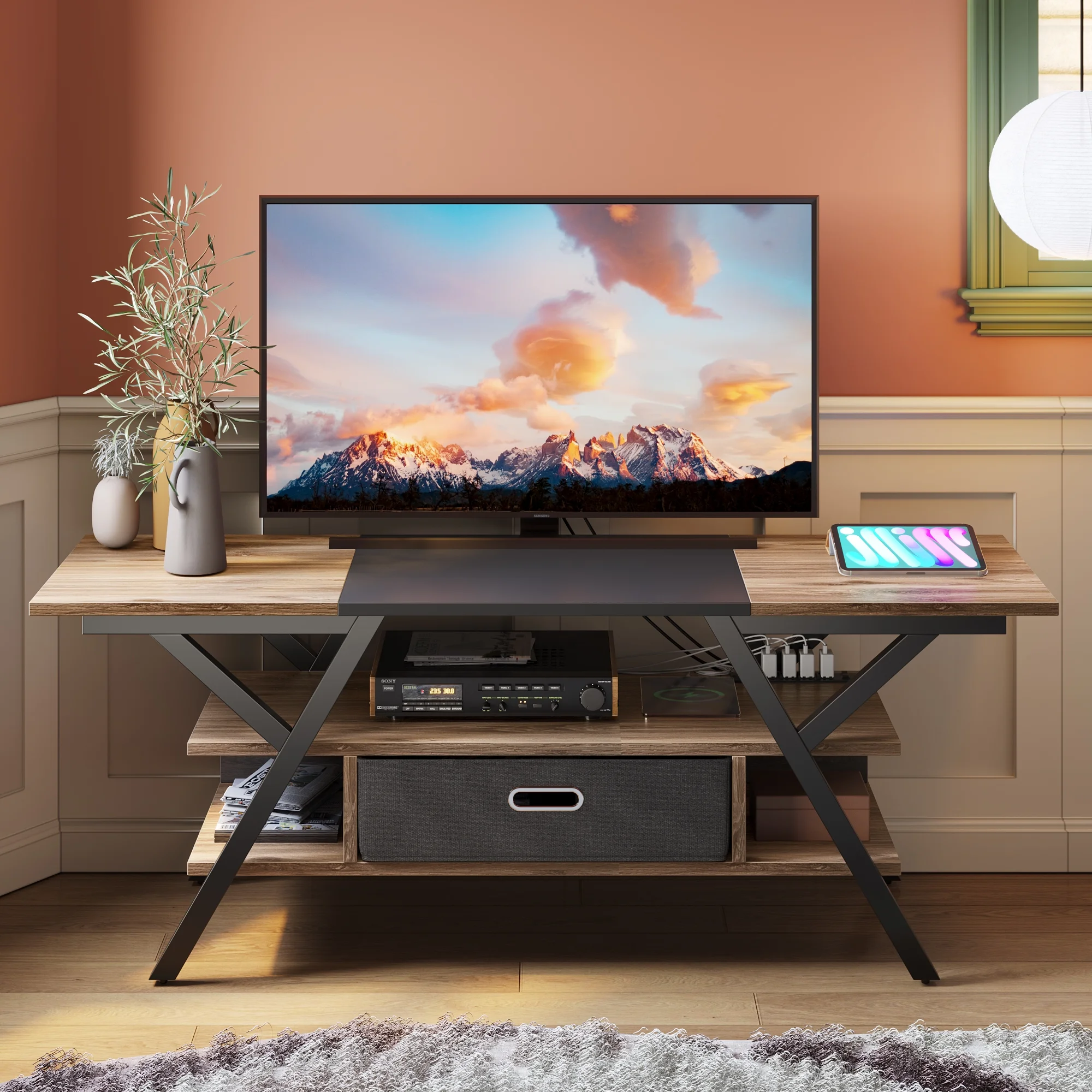 $134.95The Bestier entertainment center TV stand can hold a maximum 65-inch TV, giving your living room a fresh makeover. Made from CARB-certified P2 particle board, it offers excellent stability and durability. The standout feature is its unique Y-shaped metal design with open storage on both sides and a detachable drawer in the center, combining both open and concealed storage options. Moreover, it comes with four power outlets and two USB ports, making it easy to charge gaming devices like controllers or other electronics. You can also personalize your space with seven color options and twenty dynamic LED lighting modes. Its simple and elegant design complements any living room, study, or game room decor perfectly.