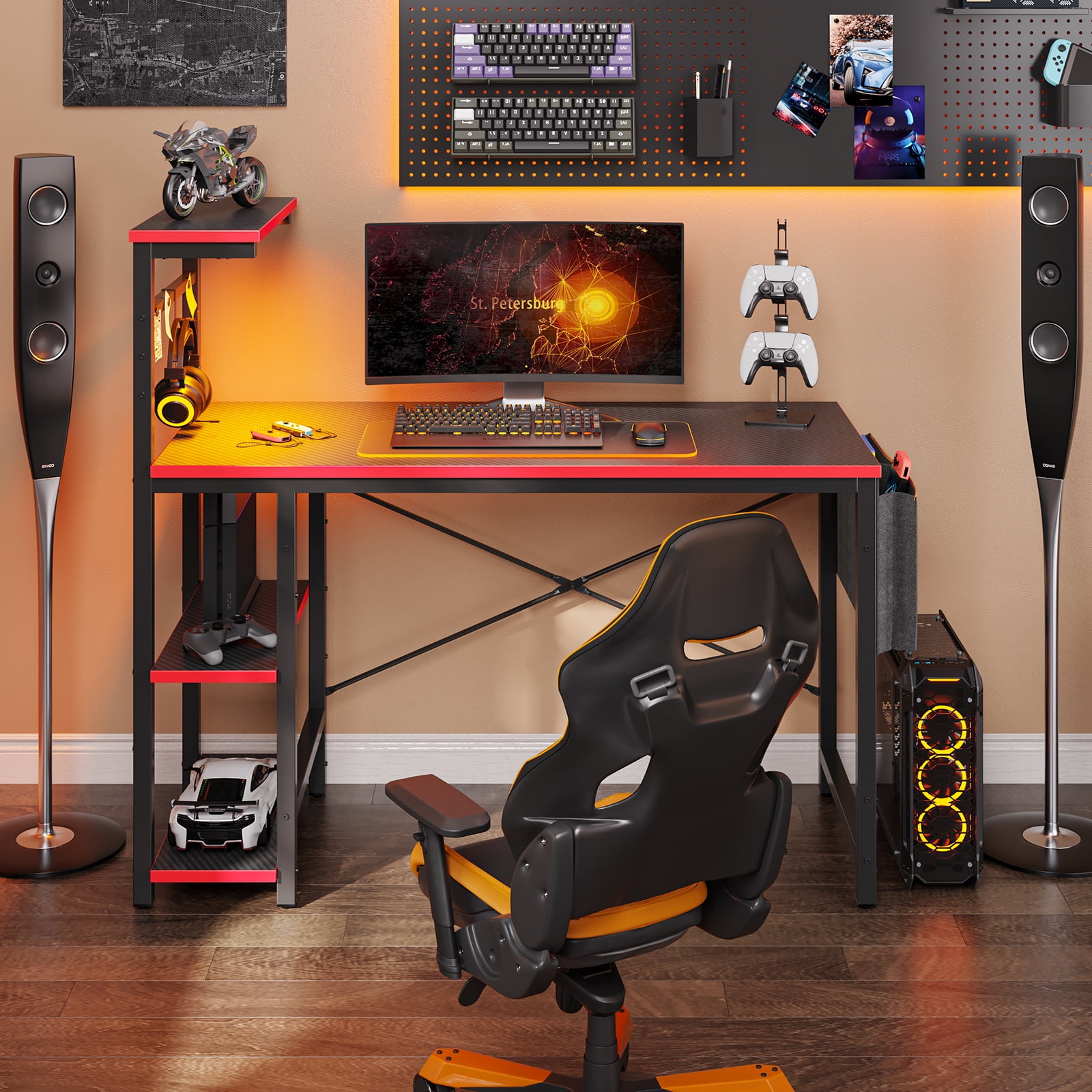 $111.79Original price was: $111.79.$60.19Current price is: $60.19.Bestier Carbon fiber gaming desk has a spacious desktop providing ample room for your monitor, PC, laptop, speakers, and more. The cool LED lights create a fun and exciting atmosphere, you will completely immerse yourself in your gaming or work time. Equipped with a headphone hook, a side pocket storage bag, and three open storage shelves, the gaming table will keep all of your gaming gear organized and be convenient for your daily needs. A perfect addition to any small home office, playroom, bedroom, dorm room, or any area that needs a computer desk.