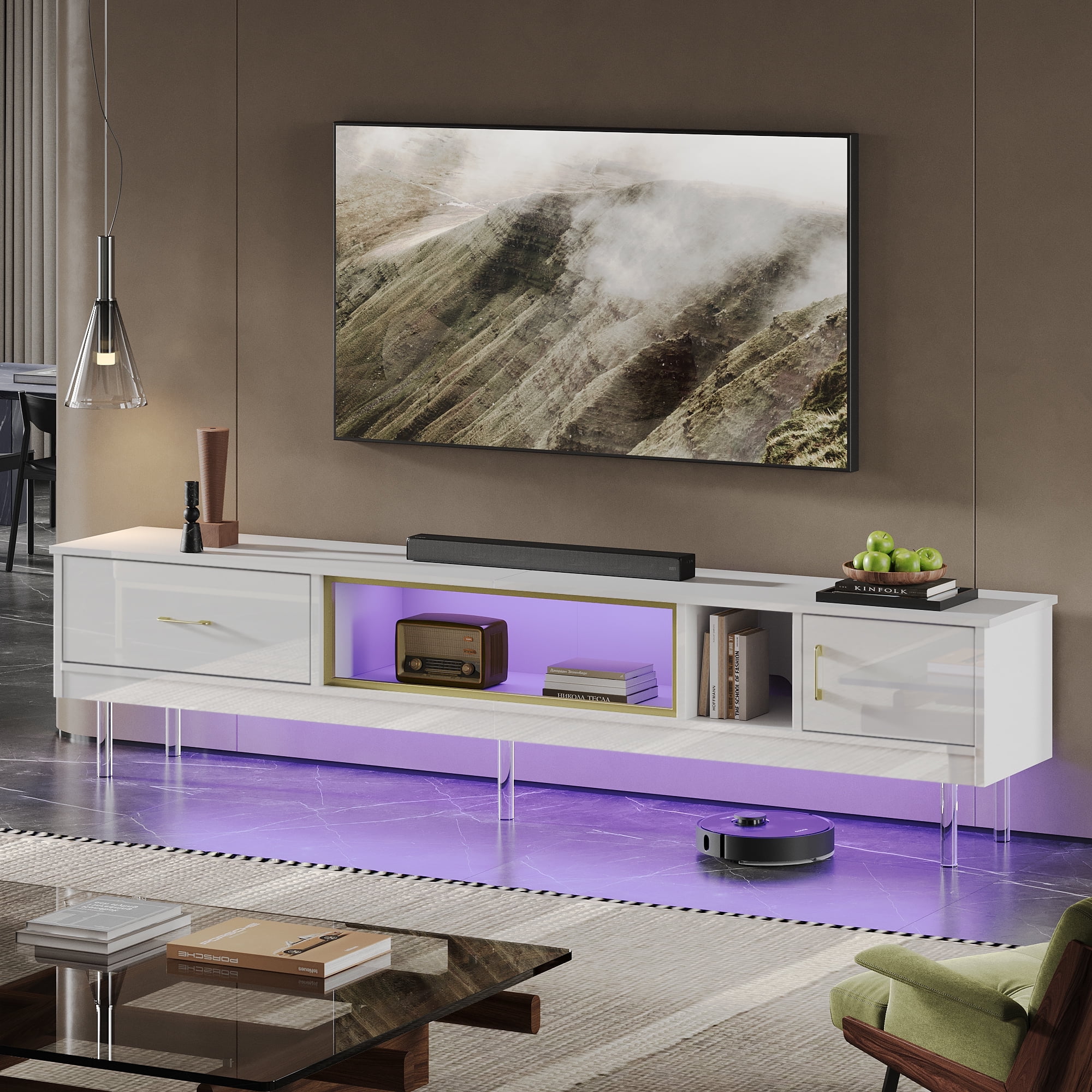 $343.99Original price was: $343.99.$137.59Current price is: $137.59.The Bestier 80-inch TV stand, on available , combines style and functionality. It’s designed to hold large TVs up to 85 inches and features a modern design with a bright front cabinet and a clear glass accent. The LED light strip enhances the ambiance and complements the modern style. The stand offers ample storage with drawers and a cabinet, perfect for gaming consoles like the Xbox controller. A unique feature is the bottom space that allows a robotic vacuum cleaner to pass through, making cleaning easier. This TV stand is a stylish and practical addition to your home.