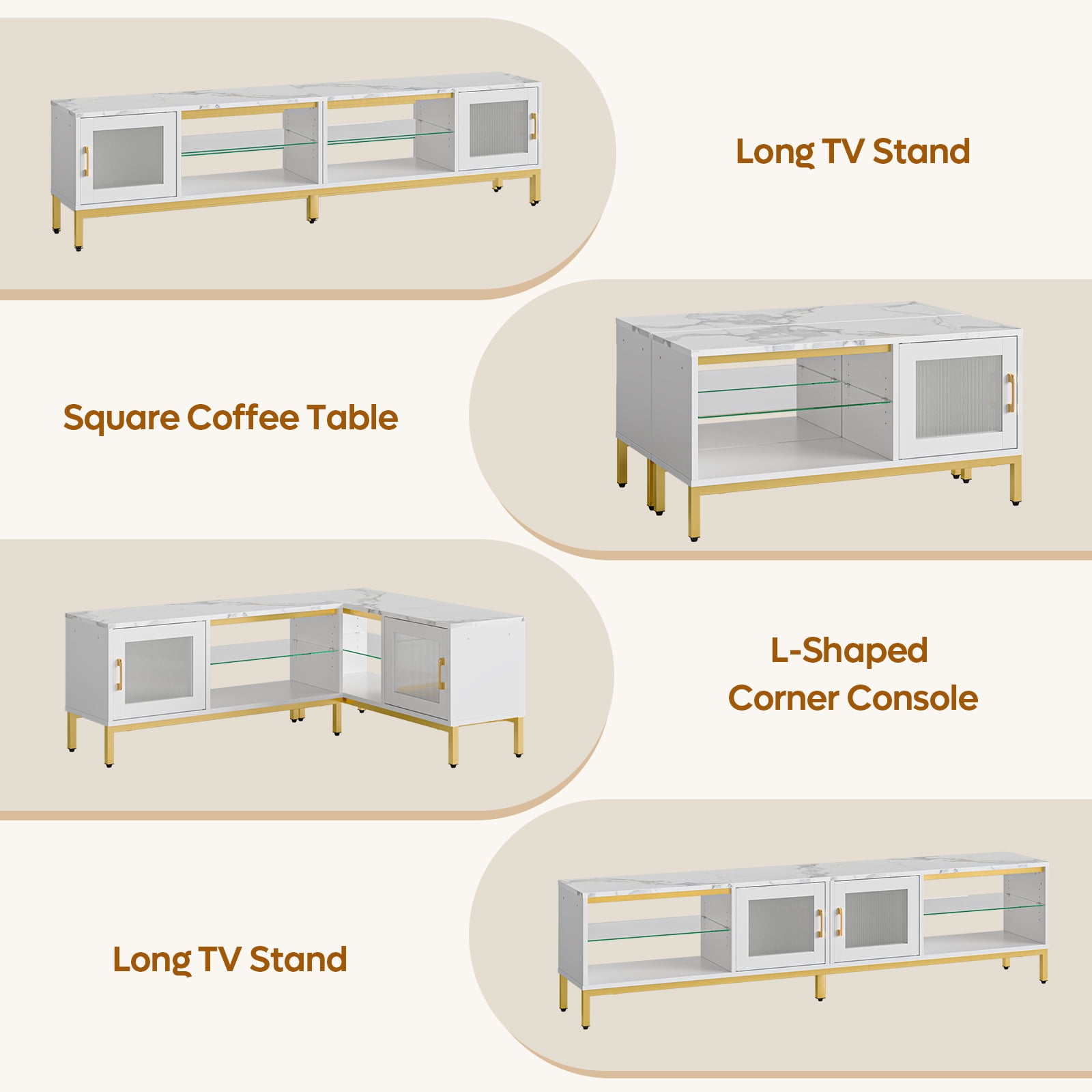 $111.71The Bestier modern 80-inch TV stand features an LED lights system with 7 main colors and 22 dynamic modes, creating a vibrant entertainment center for TVs up to 85 inches. The elegant white marble finish, combined with acrylic doors and golden legs, adds a special charm to your room. Adjustable glass shelves and storage cabinets offer ample space to store media components, gaming consoles, DVDs, books, or decorative items. This versatile led tv stand can transform into an L-shaped corner TV console or a rectangular coffee table, with four transformation styles to adapt to any bedroom, living room, or family room.