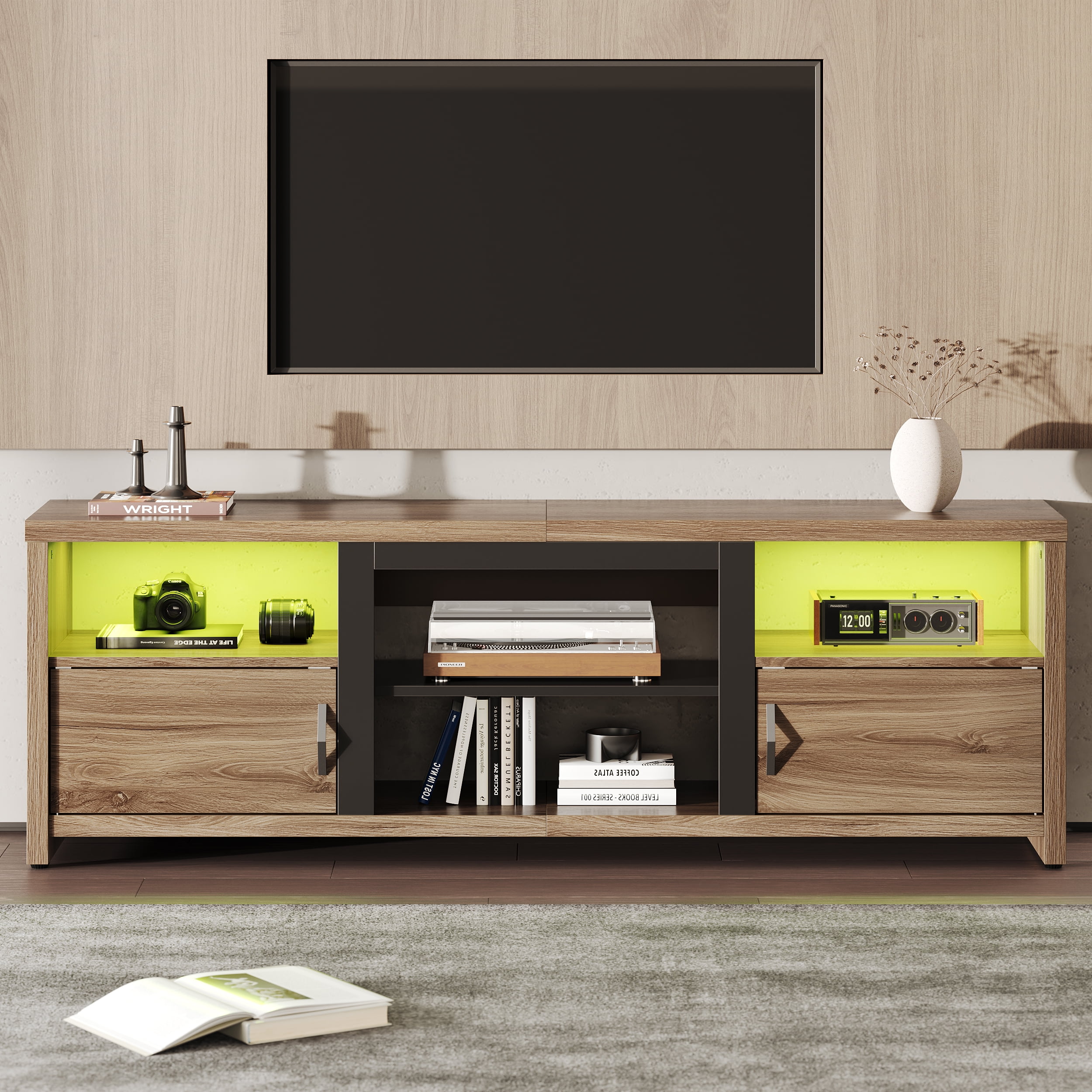 $154.79The retro-modern storage 70 inch TV stand features faux walnut wood grain detailing, made of P2 hollow-core panel and particle board, certified by CARB; its long desktop is very suitable for flat-screen TVs up to 75 inches. 6 legs are enough to support the TV console for long time use. We believe walnut wood textured finish, strong lines, and mixed color will add mid-century modern style to your any room, great for display and storage. The surface is covered with faux uneven walnut grain melamine, which is easy to clean, waterproof and scratch-resistant. Easy for you to daily clean and care. 4 holes in the back for wire management, helping media accessories of ventilation and heat dissipation. Installation Video
