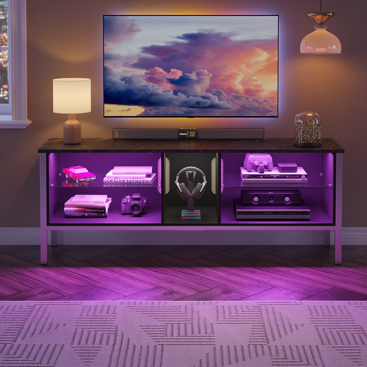 $94.59Bestier 63″ led tv stand is designed to fit into any living room, bedroom or game room. It adds a modern decor to the space. The entertainment center has five large open shelving areas to house your DVD, Switch, gaming equipment, the middle shelf can hold PS4 perfectly.The Cable Management Port is in the back, which can store the cable completely, making the whole look elegant and tidy. Tabletop with a black marble finish and long-lasting protective layer for easier cleaning. The LED light strip has 7 main colors and 22 dynamics modes and can pass the light through the glass to form the background light, so that you can switch different scenes to create the atmosphere at home according to your mood. Suit for 55″, 60″,65″,70″, TV.