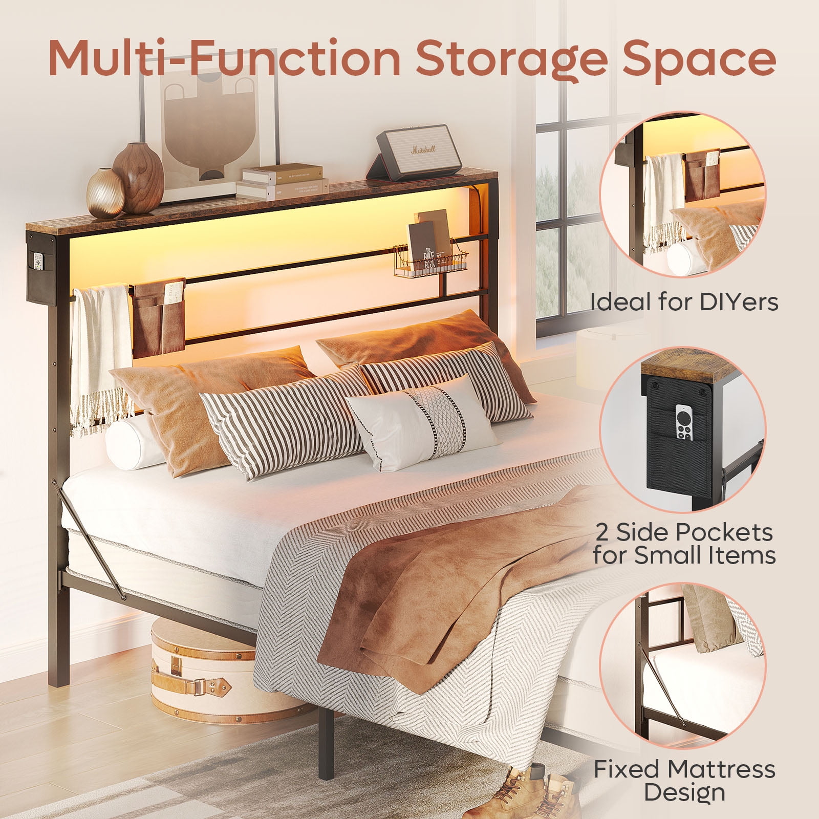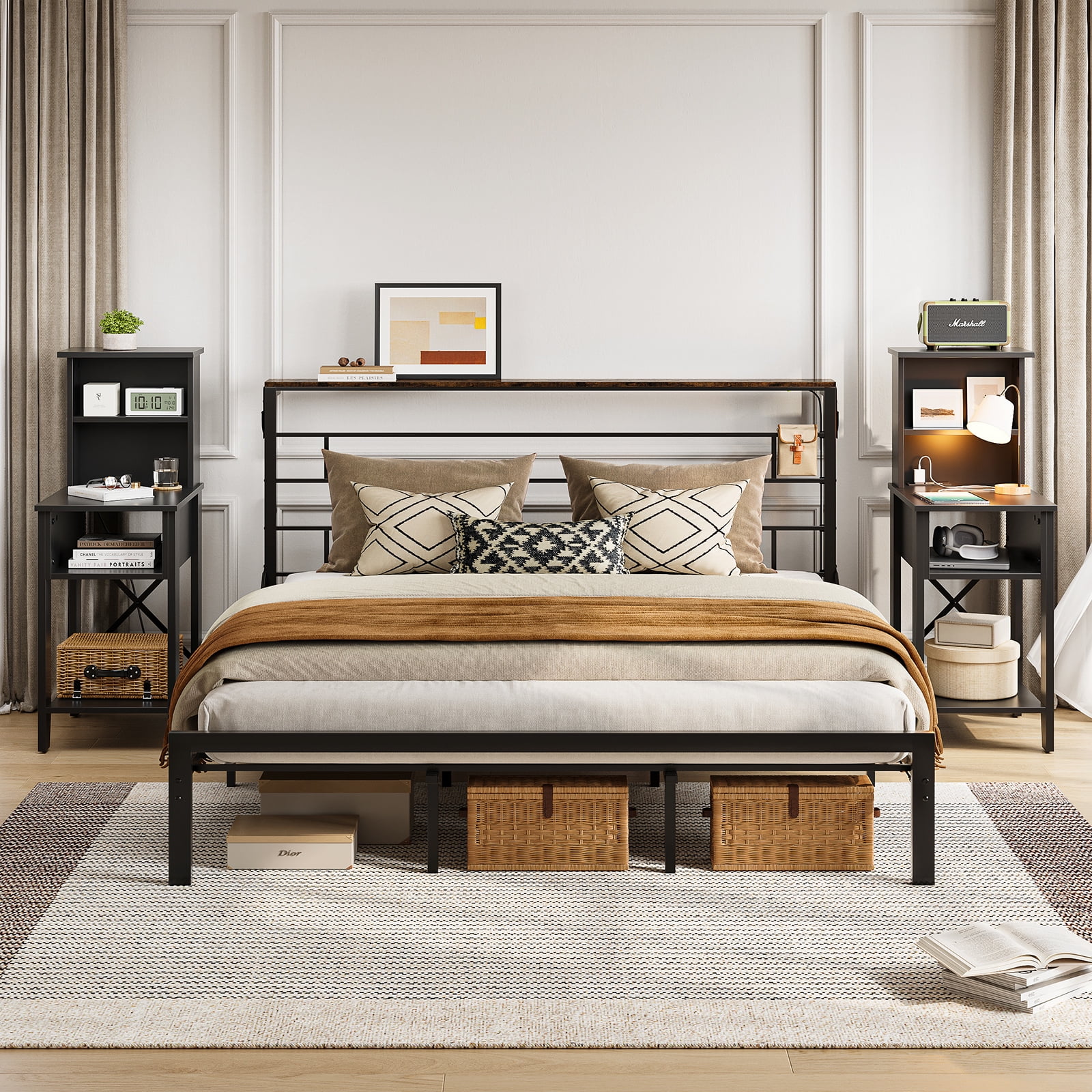 $214.99Original price was: $214.99.$120.27Current price is: $120.27.Creating a cozy fancy ambiance with Bestier Queen Size Bed Frame Led Platform Bed with Storage Headboard Charging Station.Bestier professionally crafted Bedframe brings a strong rustic vibe fits well with modern,industrial, transitional, and farmhouse decors. Our gorgeous craftsmanship wood platform bed constructed of heavy-duty steel can place your mattress directly without a box spring. This Platform Metal Bed with 16 colors 4-style rhythm brightness and speed LED by wireless remote control & App, both LED Lights on headboard and footboard can turn your room pink instantly. The 2 tier storage headboard with power socket and ample under-bed storage for extra storage convenient for everything you reach. Besiter BedFrame collection will bring you an organized lifestyle and make everything easier. Bestier Love coming home!