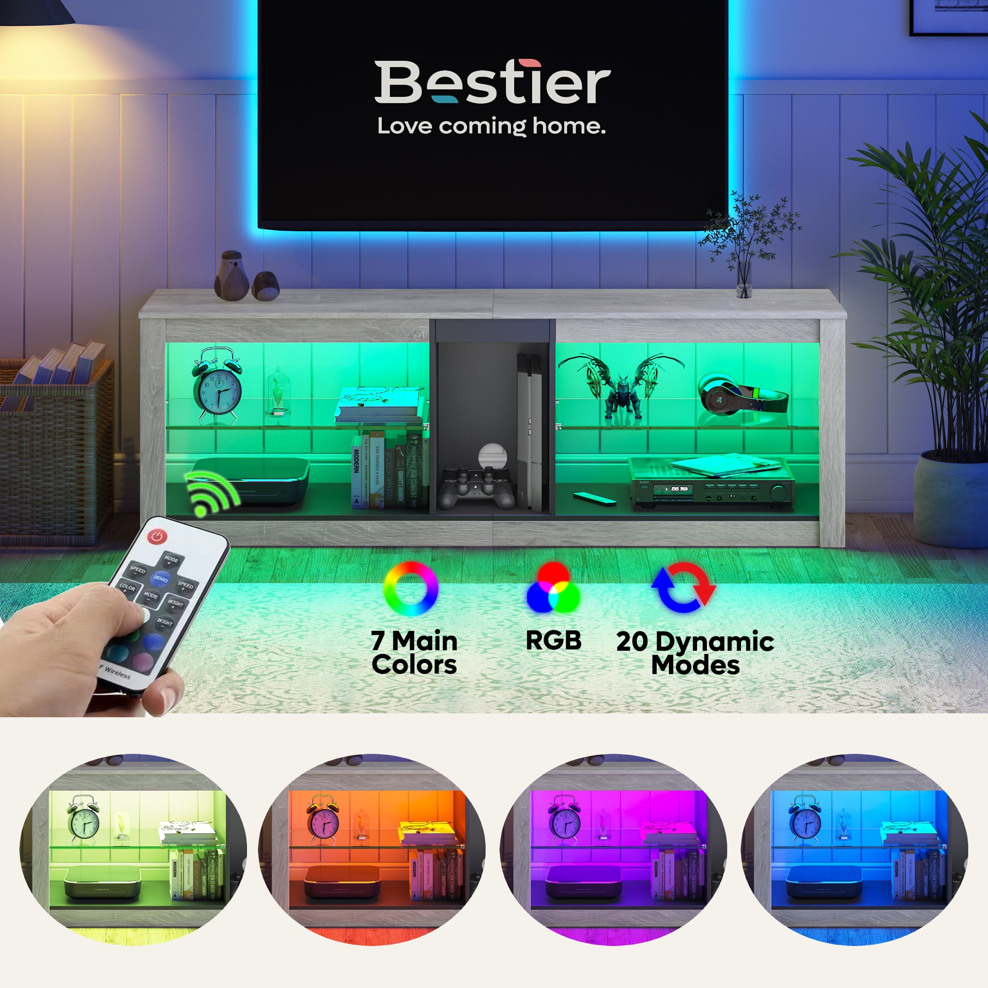 $137.59Original price was: $137.59.$77.39Current price is: $77.39.This grey entertainment center fits up to 60” TV with total weight capacity 100 lbs. Made of CARB certified P2 particle board, it offers you great stability and durability. 5 compartments is enough to store many stuff.The middle shelf is specially designed for gaming device, like PS 4. Back hole for better wire management and tidiness.Our pre-installed RGB strip light comes with user-friendly remote. you could easily pick up your favorite vibe among 7 main colors and 20 display modes.Use of tempered glass that will not burst, and when you turn on the LED light, the light will also shine through the glass to create a better atmosphere.The included anti-tip kit is designed to provide great protection for the LED TV Stand and also ensure the safety of small children and the elderly.