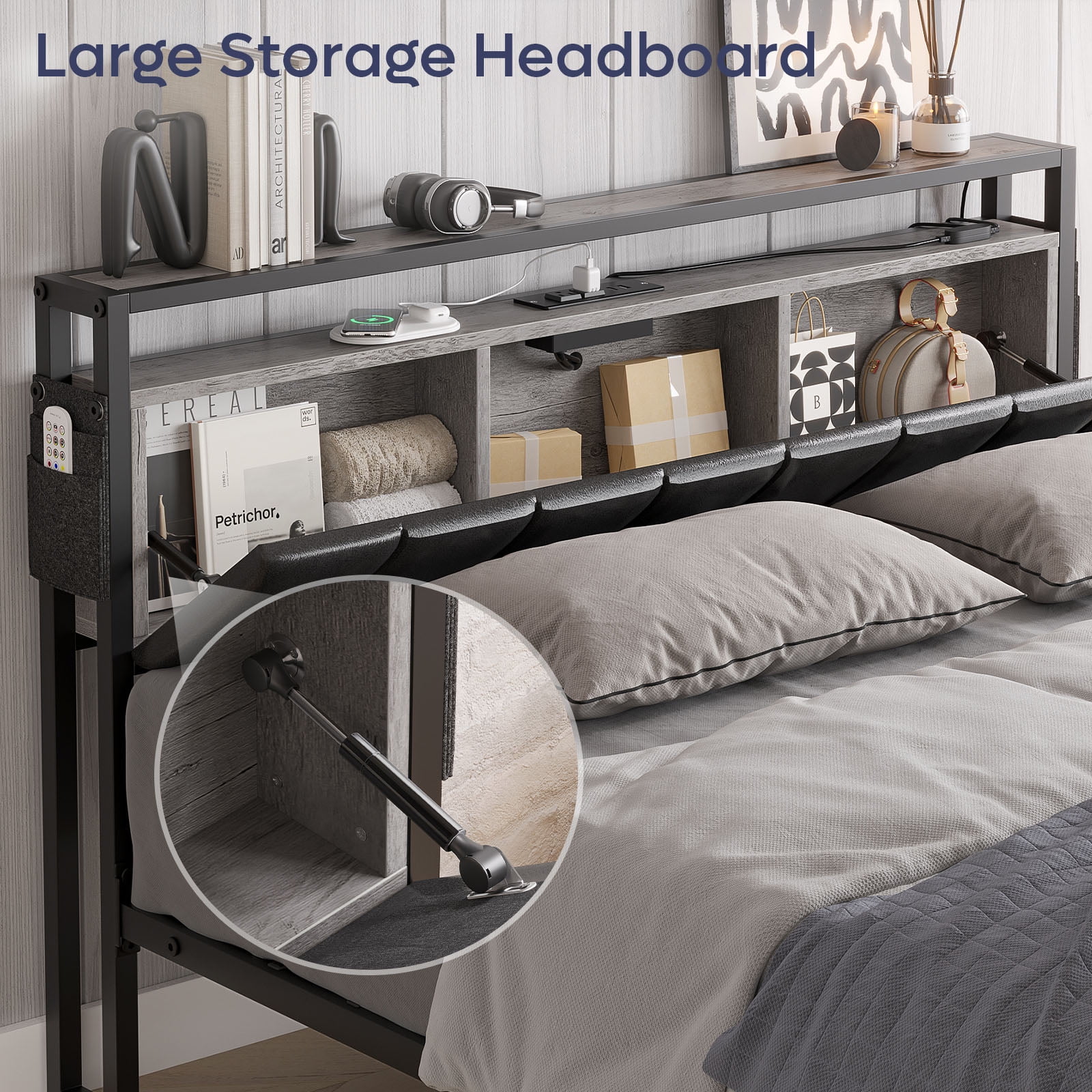Bestier Queen Size Platform Bed Frame with Led Storage Headboard Charging Station and Bedside Caddy, Grey