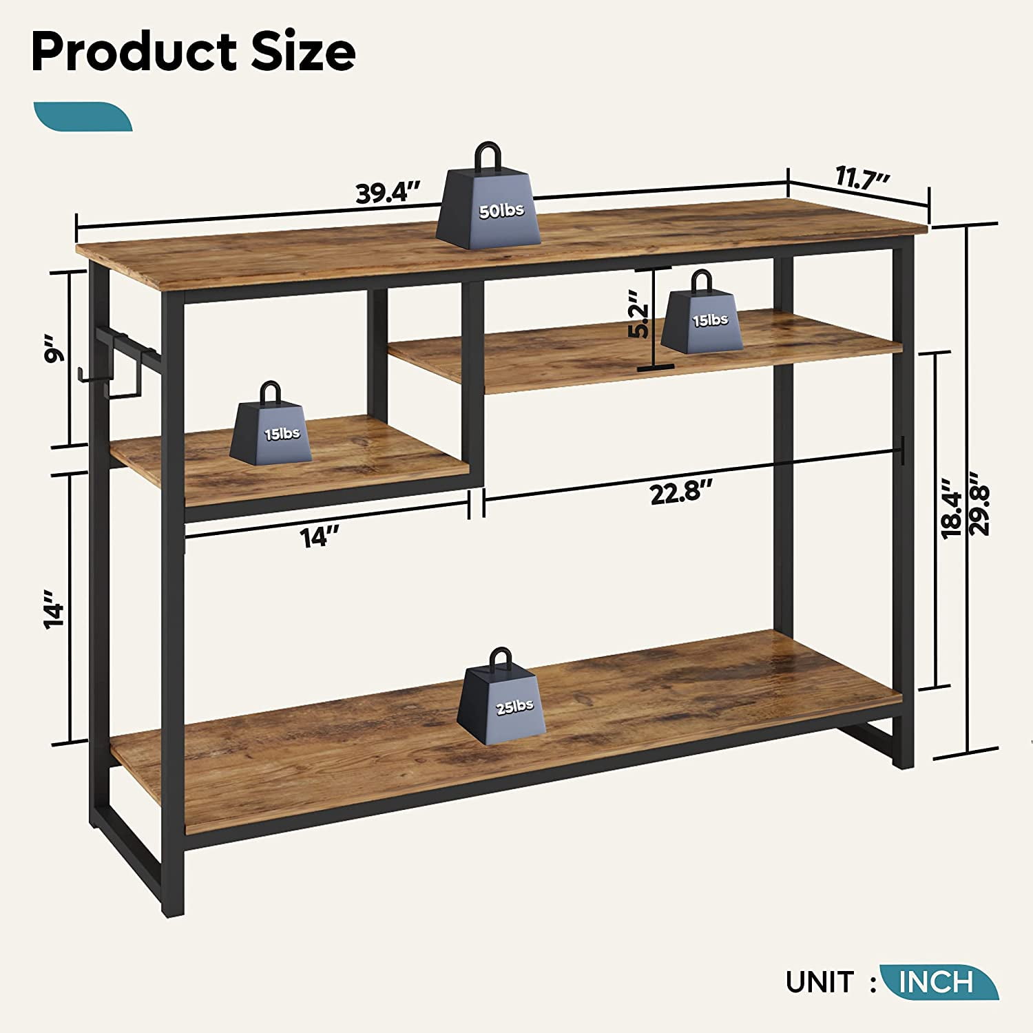 Bestier Narrow Console Table, Rustic with 4 Storage Shelves and 2 Hooks, Perfect for Living-rooms and Hallways