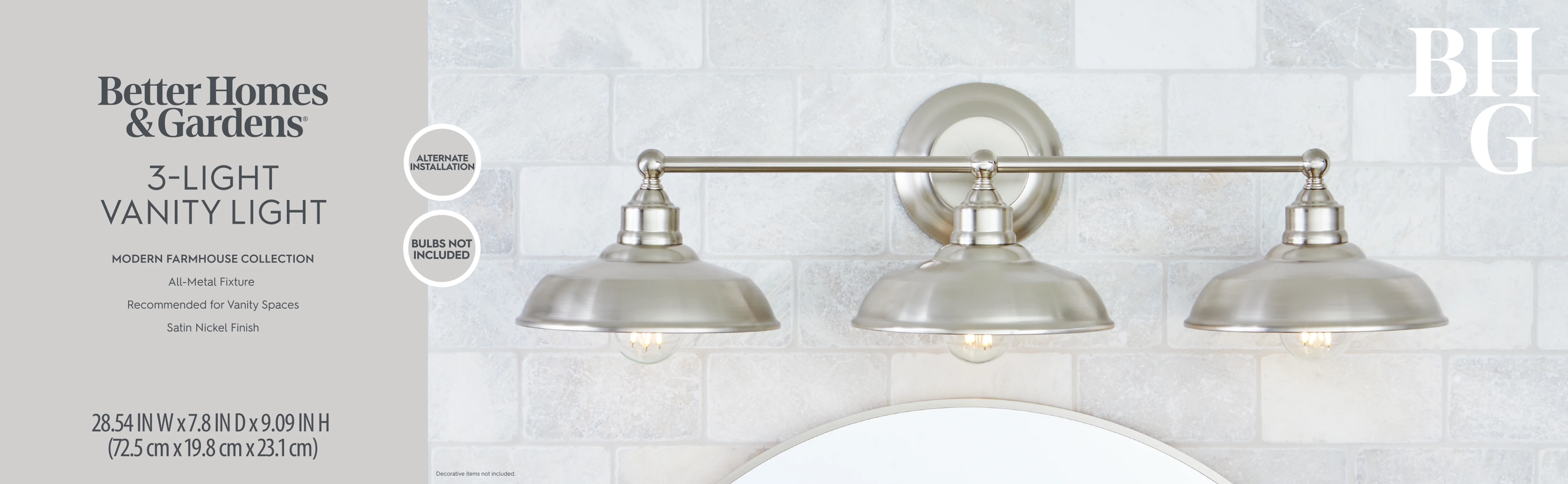Better Homes & Gardens 28.5″ Farmhouse-Style 3-Head Vanity Light , Satin Nickel Finish, E26 Socketed