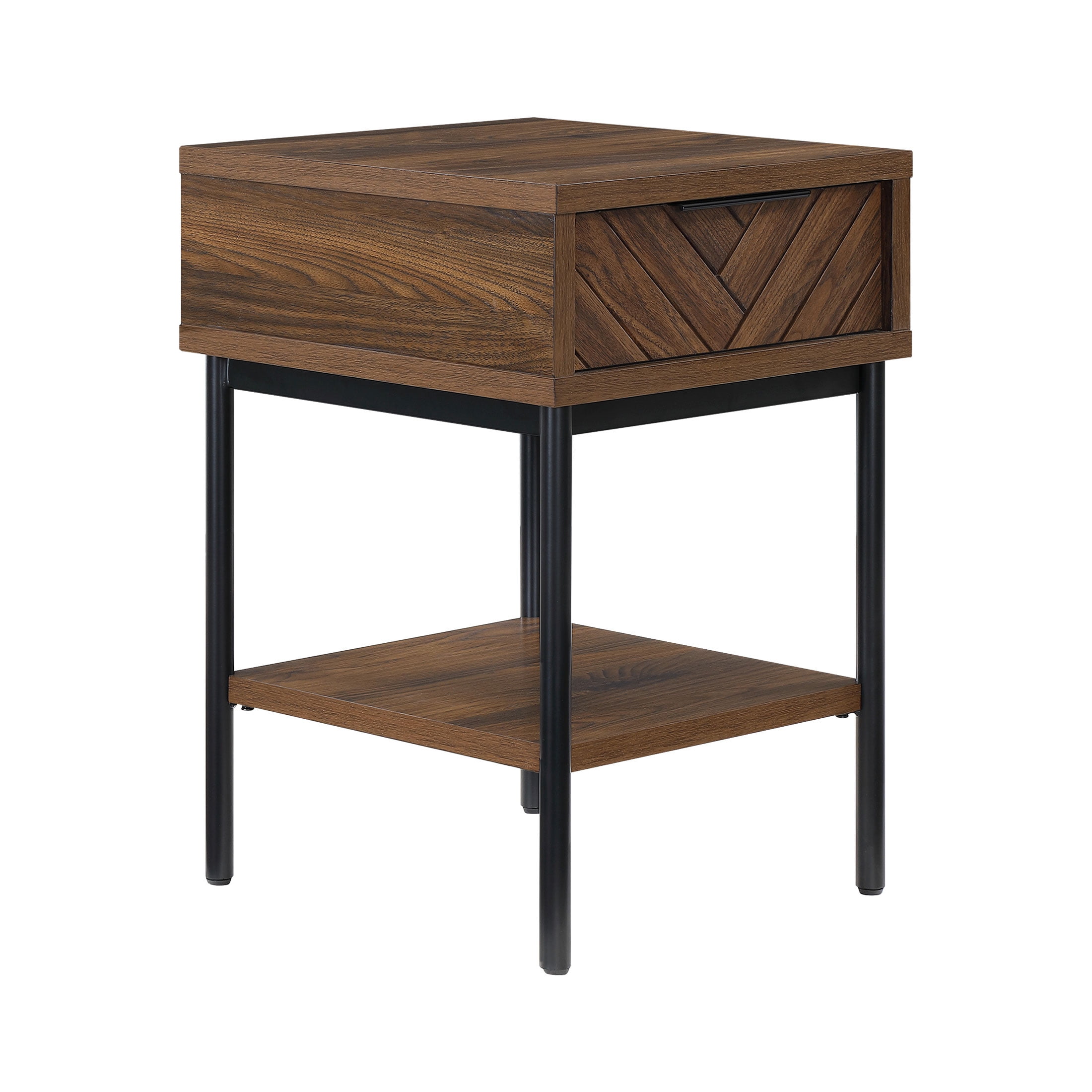 $75.68Elevate your living space with the Wyatt Geo End Table from Better Homes & Gardens, where modern elegance meets craftsmanship. This charming side table is a versatile companion for your daily life. Imagine having your essentials within arm’s reach, neatly stored away in the upper drawer. From remotes to keys, or even a cherished novel, this table keeps everything organized while adding a dash of style. The drawer boasts a contemporary herringbone pattern, enriching the table’s texture and depth, making it a standout piece. The open shelf offers the perfect spot for your decorative pieces, greenery, or your favorite magazines, blending functionality with aesthetic appeal. Resting on sleek black metal legs, this side table presents a modern silhouette that complements its rich brown finish beautifully. The minimalist design adds a contemporary touch, and the quality engineering ensures stability and durability for years to come. Designed to harmonize with any room, the Wyatt Geo End Table pairs splendidly with the Wyatt TV Console, Coffee Table, or other items from the Better Homes and Gardens Wyatt Collection (sold separately). Whether it’s set beside a cozy sofa or a comfy armchair, this side table is a chic and practical addition to your home. Its blend of form and function effortlessly enhances any decor, bringing a timeless charm and a touch of sophistication to your living space.