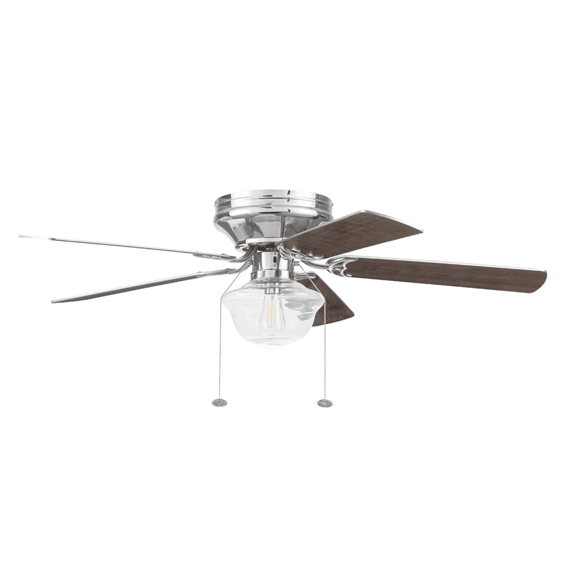 $67.94This classic style fan features stylish details and pairs well with most home décor. This brushed nickel ceiling fan has a clear schoolhouse globe shade and a clear edison bulb, providing beautiful lighting. The traditional 5-blade design provides comforting, adjustable airflow while the LED lights provide ideal lighting for the area. Easily control your ceiling fan’s 3 speeds and turn the light on and off with the traditional pull chains. Use the reversible airflow switch to easily allow you to change the direction of the fan to properly distribute air. During warmer months, this fan will provide a cooling effect or when reversed during the cooler months, it will help distribute warm air. This ceiling fan was created with high-quality materials that are durable and long-lasting and comes with a limited lifetime warranty from the manufacturer. Specifications: Sizing: 52-in 5-blade indoor fan for rooms up to 216 sq. ft. Lighting: 1 x E26/ST19 light bulbs included that provide 800 lumens, 8 watts, 2700k color temperature