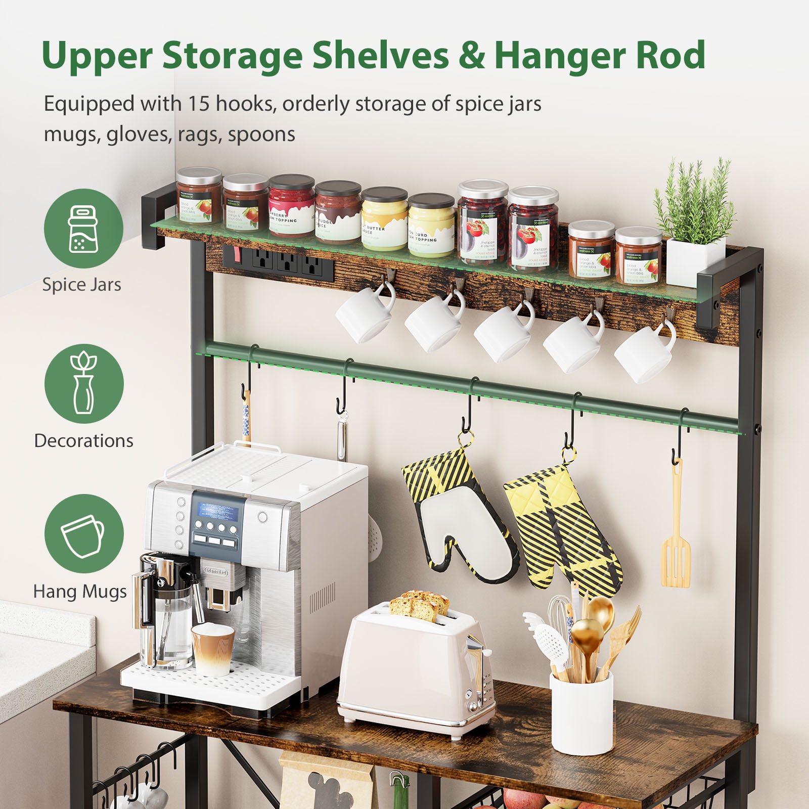 Biemlerfn 39″ Wide Large Bakers Rack with Power Outlets, 5 Tiers Coffee Bar Table with 3 Wire Basket, 15 Hooks, Microwave Stand Kitchen Storage Shelf, Rustic Brown