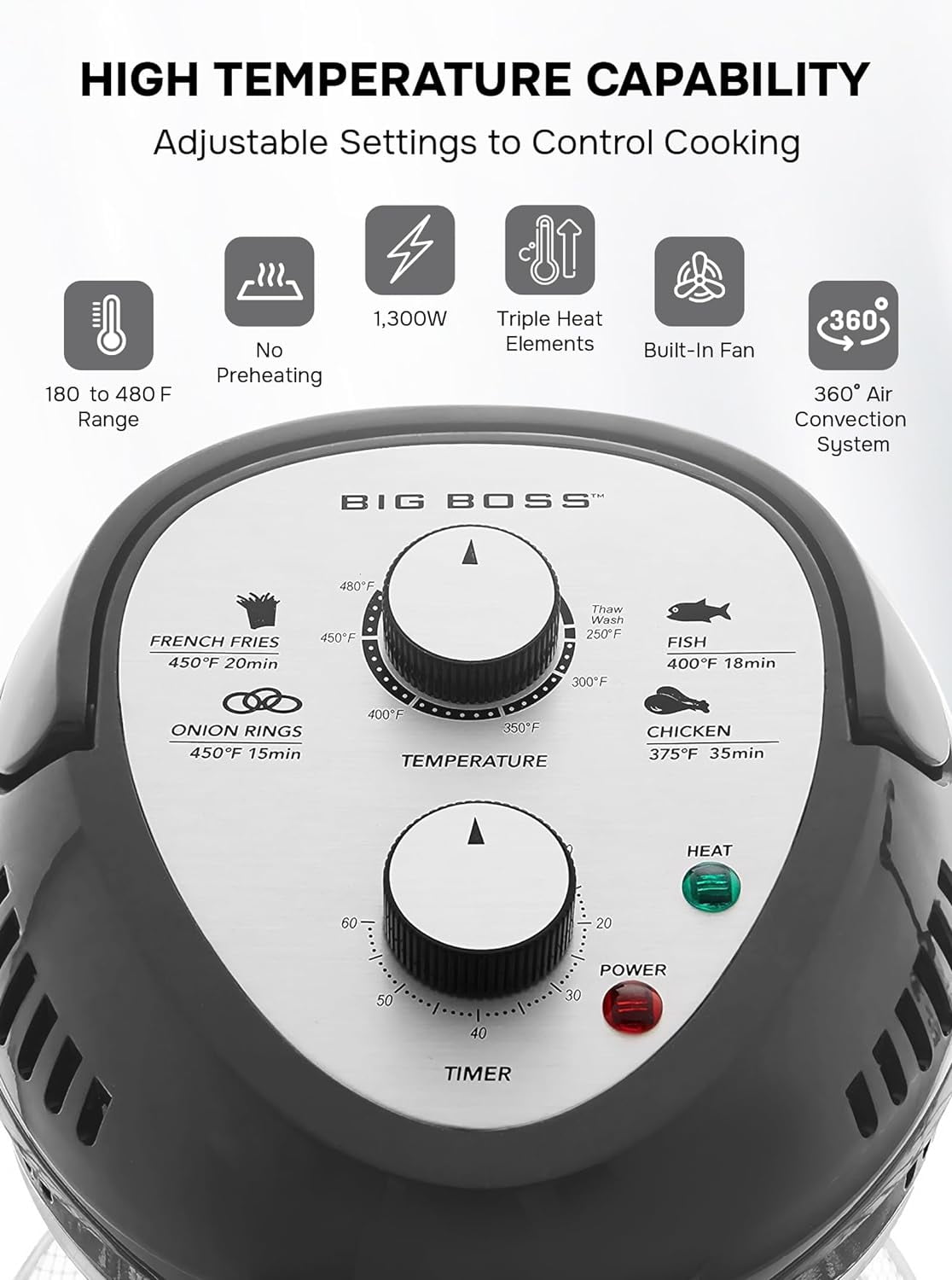 Big Boss Air Fryer Toaster Oven Combo 16Qt Kitchen Countertop Convection Rotisserie 1300W Large Glass Bowl Gray