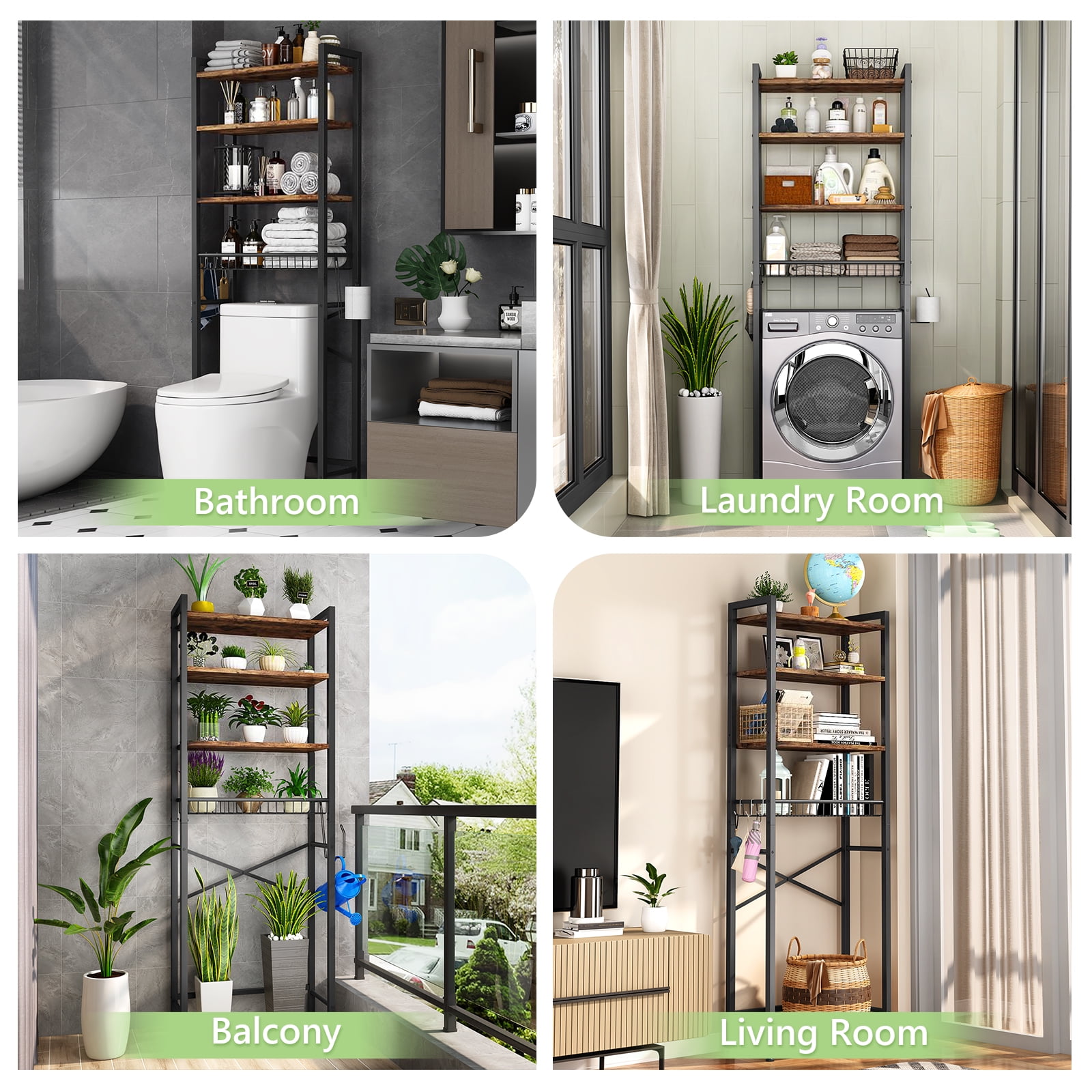 Biemlerfn Over The Toilet Storage Shelf, 4-Tier Wooden Bathroom Organizer Adjustable Saver Space Rack with Toilet Paper Holder, Vintage Brown