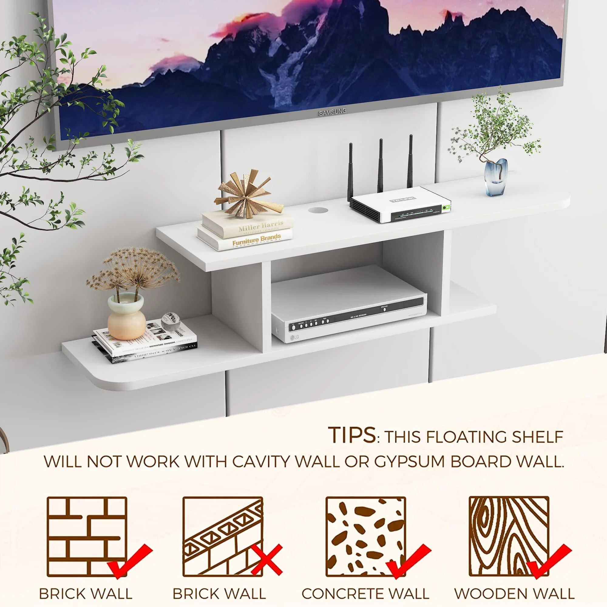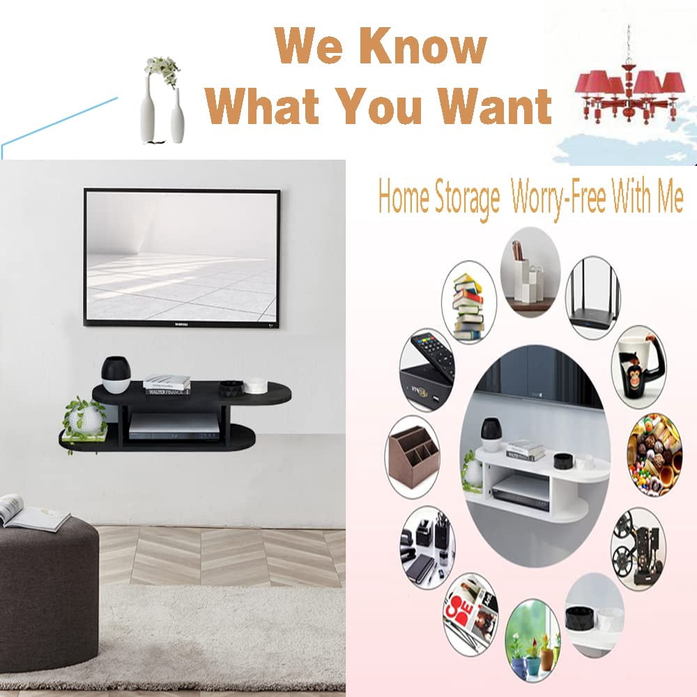 $51.59★Floating TV shelf wall mounted modeling simple fashion, dress up living space, Fresh and natural beauty for organizing and displaying your TV and media accessories. This sleek floating TV shelf wall mounted is designed to be mounted directly on the wall, creating a floating effect that adds a touch of contemporary elegance to your space. ★Floating TV shelf made of paint-free particle board sheet, which is healthy and environmentally friendly, has strong texture and is not easy to be deformed, the surface is made of matte paint, easy to clean,scratch resistant. ★Humanized design, wires and routers are left blank for easy finishing; perforated installation design is tightly integrated with the wall surface, more stable.round corners offer protection for children from bruising and getting hurt ensuring the safety of your family. ★This wall console shelf can be used with different wall mounted TV models, It is functional as well as a decorative wall TV console to complement. No competition with the room,Placement everywhere.Can be placed on the countertop and hung on the wall, go with your heart. ★Not only is it ideal for storing routers, set-top boxes, DVD players, etc. But it is also an ideal choice for excellent decoration, multi bureau storage, easy to accept small objecte.Work hard to meet the high quality of you.Which can perfectly fit all your furniture. Suitable for home, restaurant, hotel, office, etc.