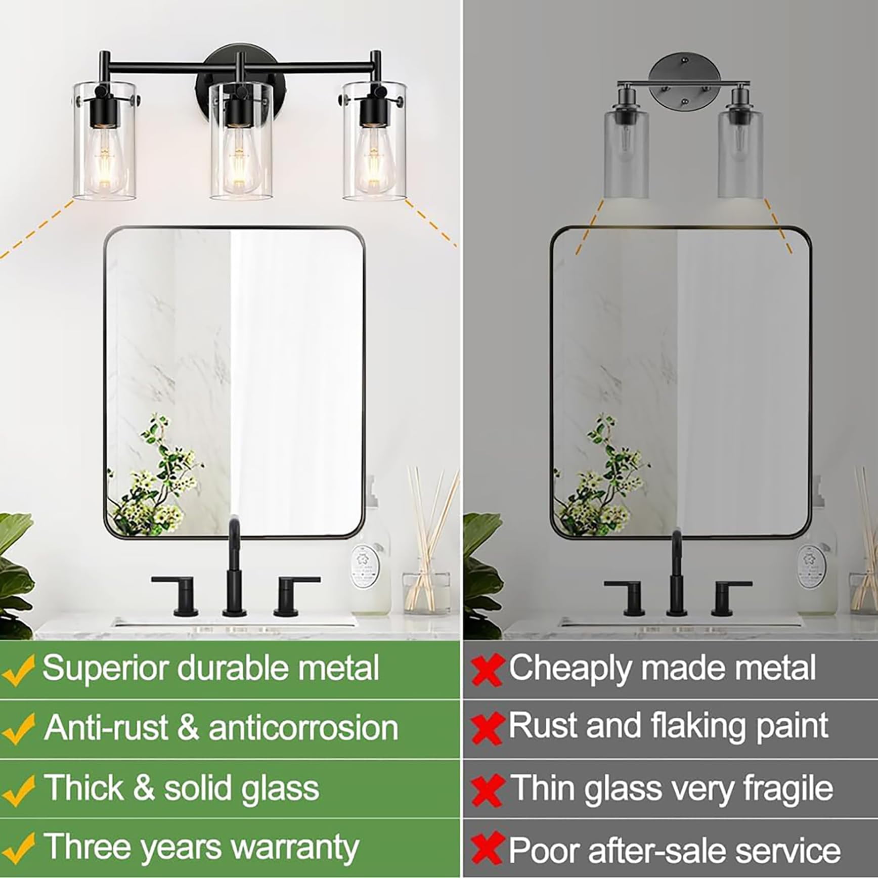 Binsuca Bathroom Light Fixtures, 3-Light Matte Black Bathroom Vanity Light, Black Bathroom Lights Over Mirror with Clear Glass Shade, Bathroom Wall Sconces for Mirror Bedroom Living Room Hallway