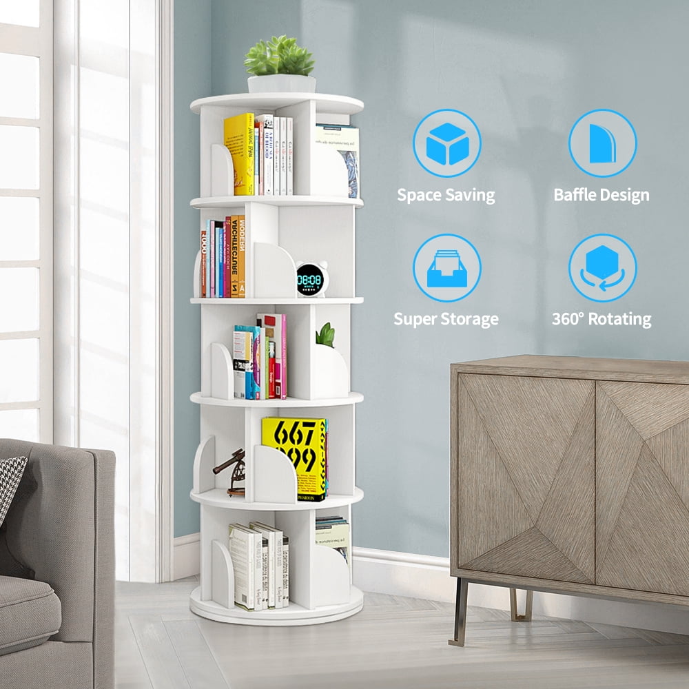 Bimiti 5 Tier Rotating Bookshelf, 360° Revolving Bookcase 20 Shelves Floor-Standing Storage Display Rack – White 63″x18″x18″, Adult