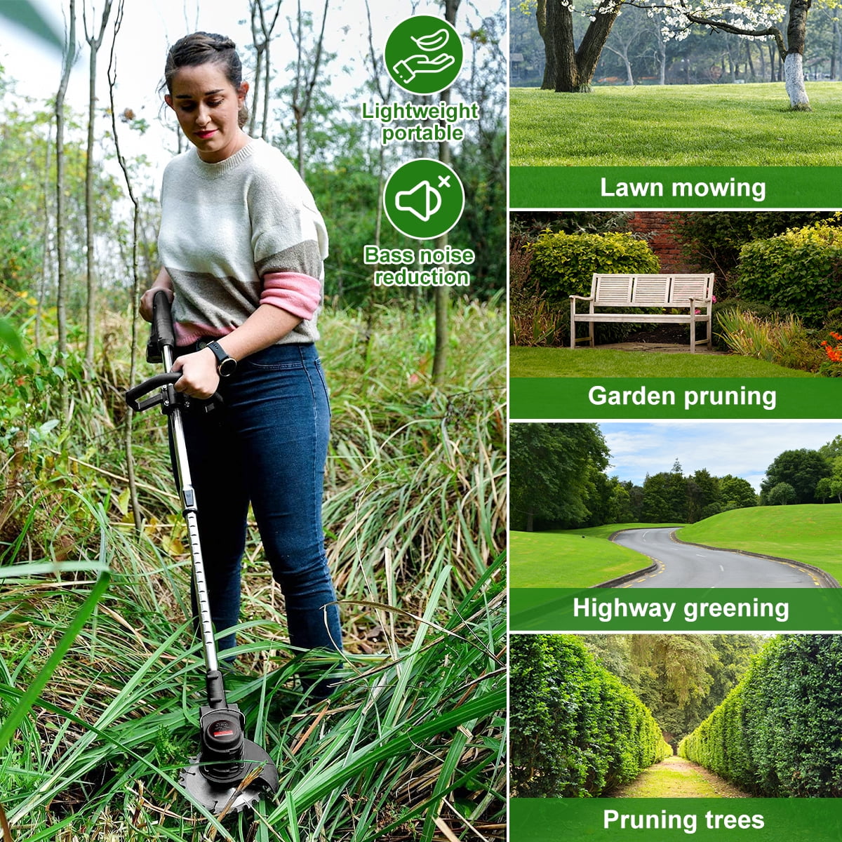 $42.73Product details Describe: This is a Biuble 48V electric lawn mower with a wireless and portable design.You can choose according to your needs. One-button adjustment of the working angle, convenient for trimming under trees, corners of walls, edge of flower beds, etc. Suitable for pruning gardens, pastoral grass, parks, villas, small shrubs, etc. Specification: Name: Lawn mower Material: ABS+metal Color: Black Battery: Lithium battery, 48V, 12000*2mAh (inclusive) Power: 1350W Speed:18000 RPM Each run time: 120-150 minutes Charging time: about 120-180 minutes Packing List: 1* Cordless Electric Weeders 1* Round saw blade 2* Metal blade 5* Plastic blade 2* Battery 1* Wrench 1* A pair of gloves 1* Goggles 1*US standard charger 1*Instruction manual