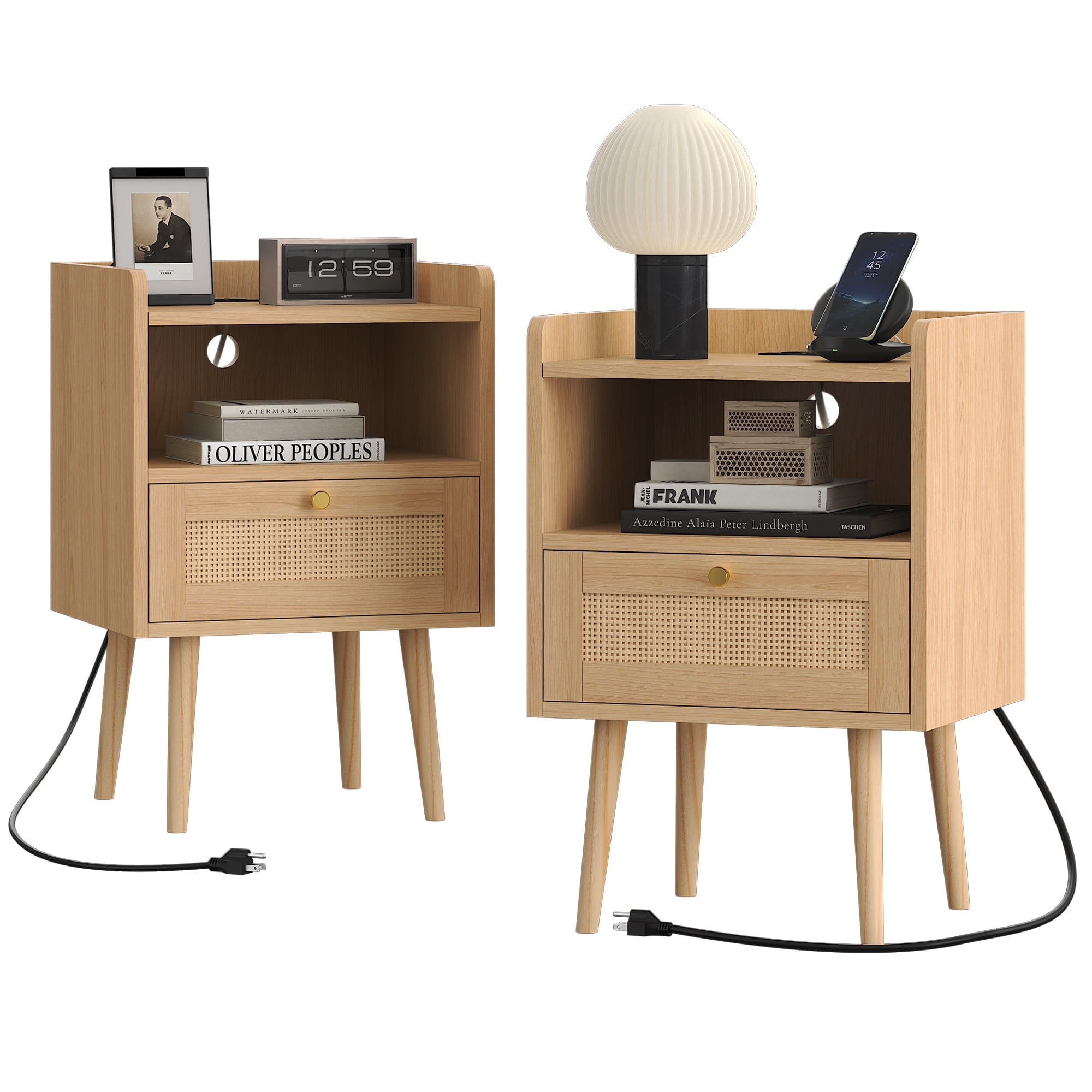 Biuhony Rattan Nightstand with Solid Wood Legs,Bedside Tables Rattan Drawers with Charging Station for Bedroom and Living Room, Set of 2