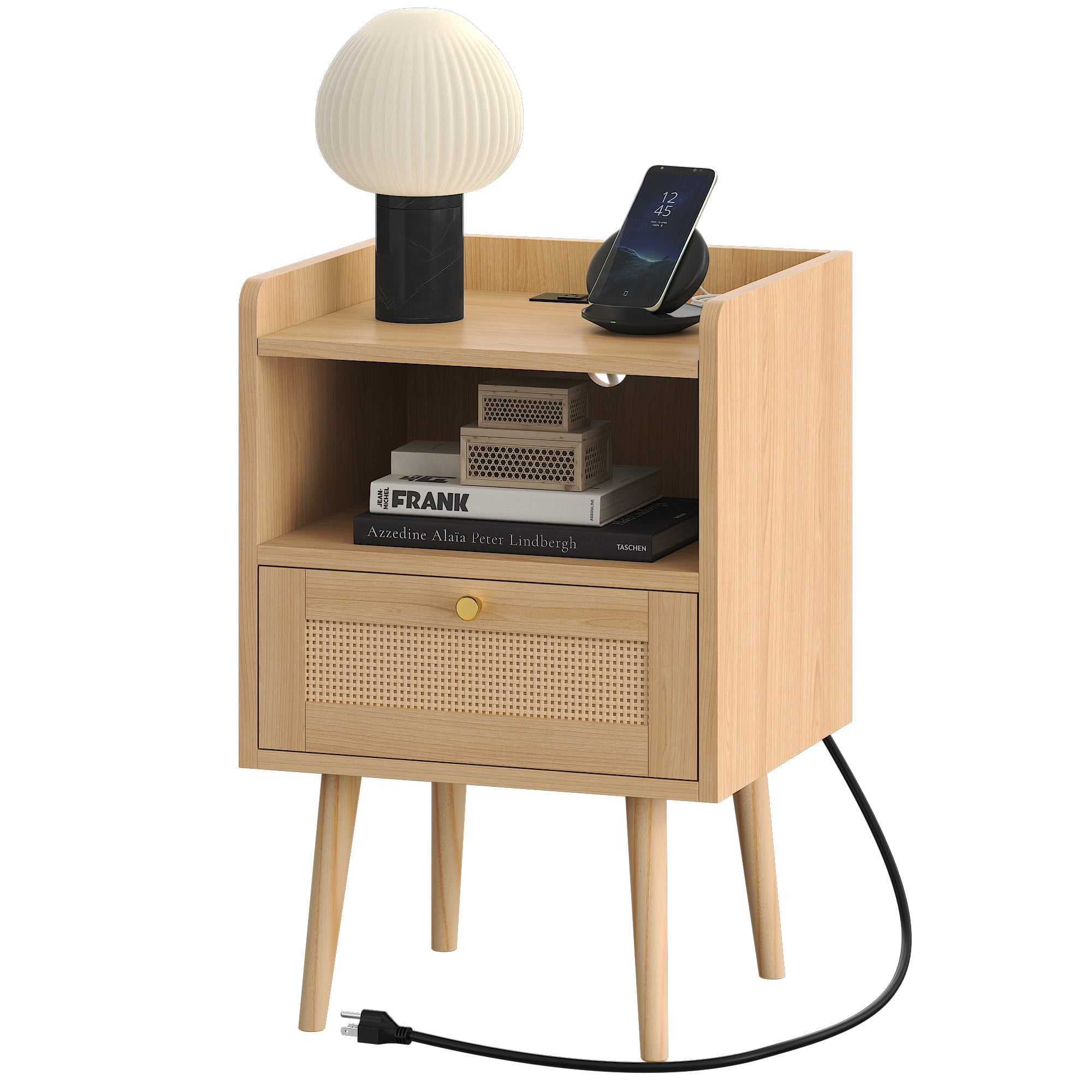 Biuhony Rattan Nightstand with Solid Wood Legs,Bedside Tables Rattan Drawers with Charging Station for Bedroom and Living Room