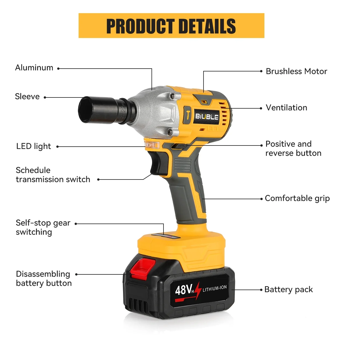 $51.59Original price was: $51.59.$45.57Current price is: $45.57.Description: BIUBLE Cordless impact wrenches with high specification powerful motors help you easily loosen or tighten all types of bolts or nuts, including those on trucks, cars, scaffolding and more. Maximum torque is 1000N.m at 3300RPM . Tool speed can be increased by increasing the pressure on the switch trigger. Brushless motors offer better performance and longer durability than brushed motors, less noise and avoid sparks. Definitely a good partner for your work! Type: Cordless Electric Impact Wrench Features: Compact, Lightweight Battery Technology: Lithium-Ion (Li-Ion) Power Source: Battery No-load speed: 0-3300RPM Max. Torque: 1000 N.m Power: 800 W Motor Type: Brushless Chuck Size: 1/2 inch Voltage: 48V Corded/Cordless: Cordless Number of Batteries: 2 Color: Yellow Set Includes: 1* impact wrench 6* sleeves (specifications: 22mm+21mm+19mm+18mm+17mm+14mm) 1* Adapters 1* Connecting rods 1* Leather loops 10* Different gauge sleeves 1* rubber pin 3* Twist drill bits(3/4/5mm) 1* 6mm universal drill bit 2* Batteries 1* US Charger 1* Storage box