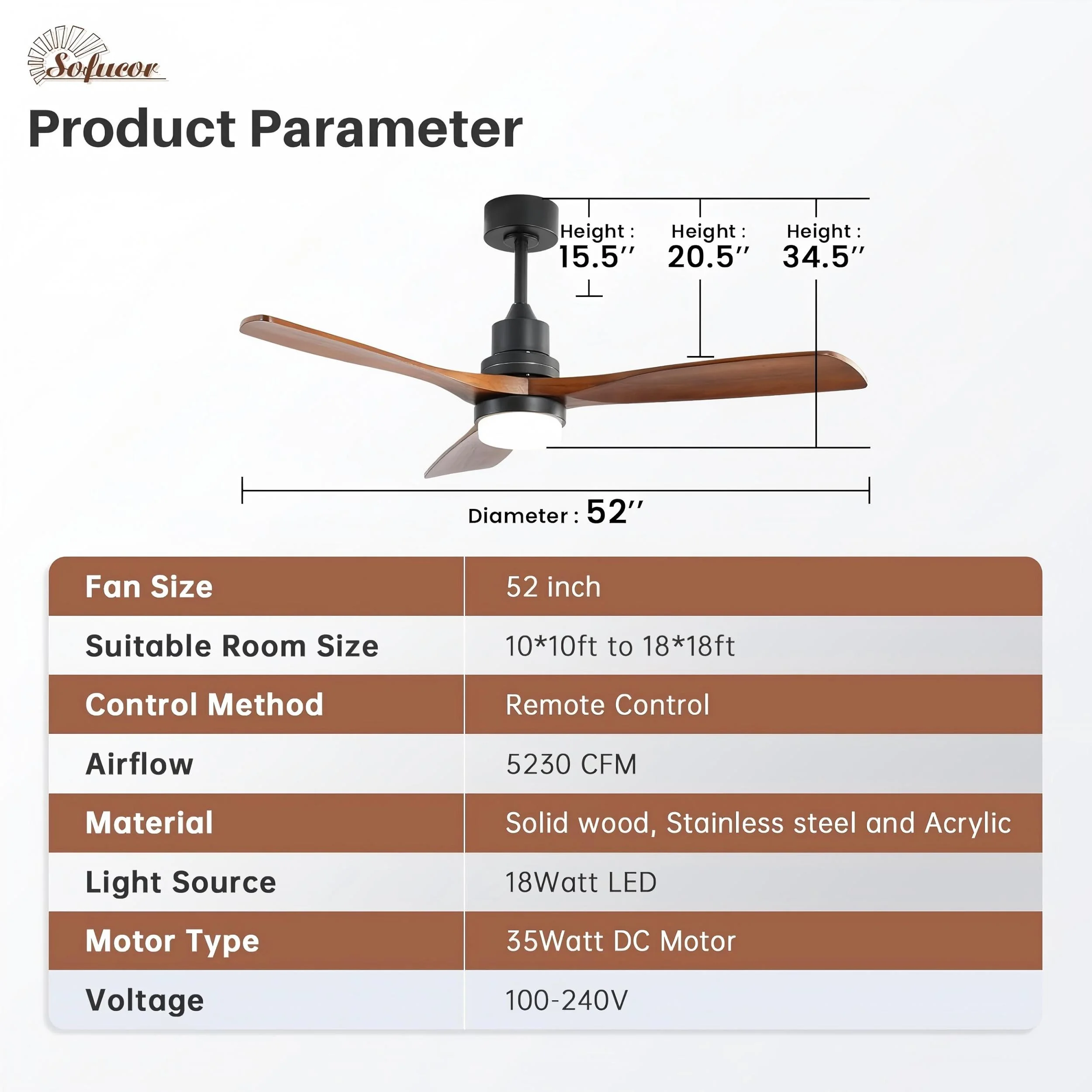 “Sofucor 52″” Ceiling Fan with Lights, Remote Control, Reversible Noiseless Motor, 3 Walnut Wooden Blades”