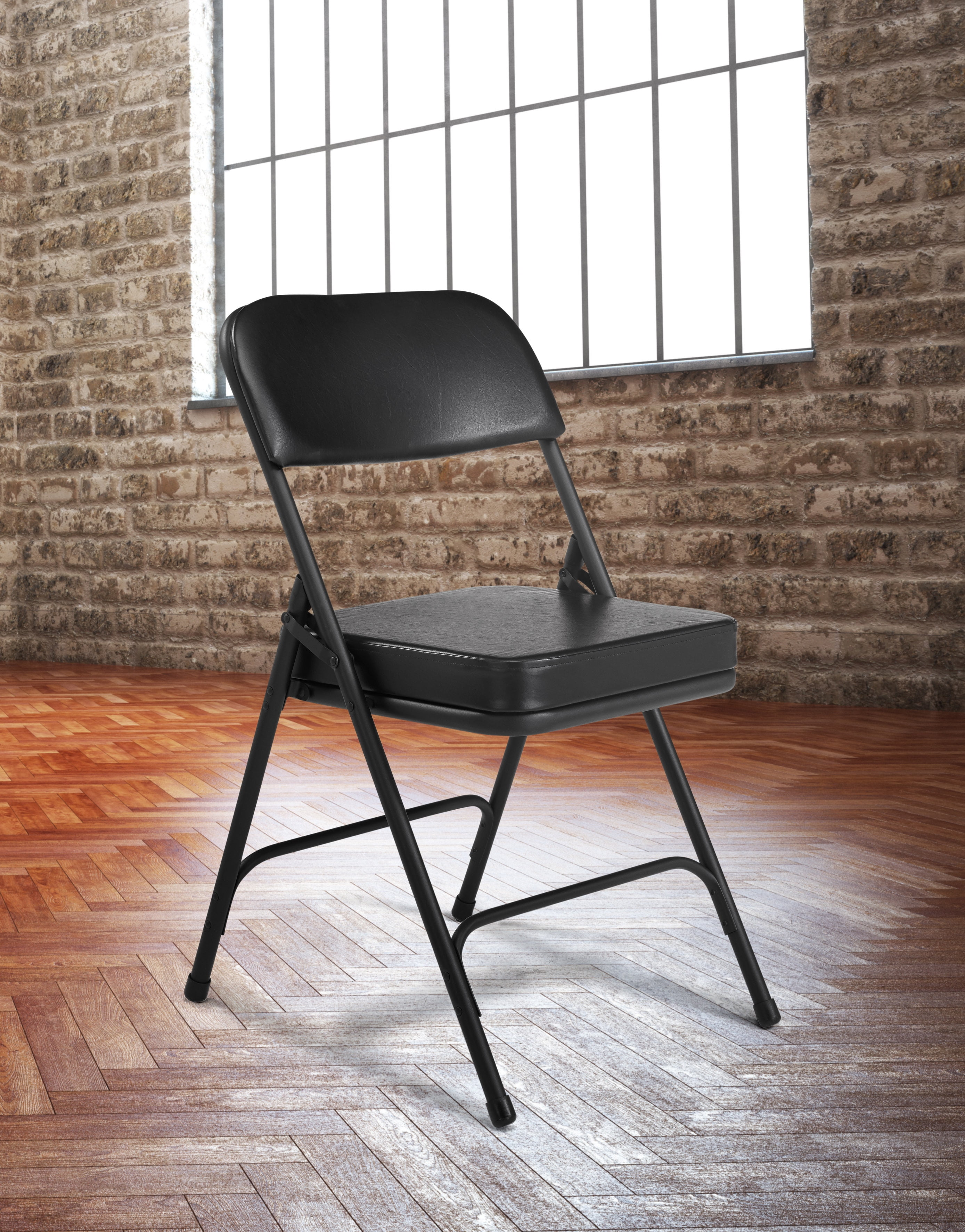 $77.39NPS 3200 Series has brought the potential comfort of folding chair to a whole new level with a super-soft 2 inch thick cushion. Features include an institutional-grade black vinyl upholstered box seat on a masonite board. The large contoured padded backrests are fully covered in matching black vinyl on both sides. The institutional-grade frame is made from heavy-duty black powder-coated 18-gauge round tubing with two U-shaped double-riveted cross-braces to securely support the double-hinged legs. Color-coordinated V-tip stability plugs provide added reinforcement and matching replaceable glides prevent floor damage.