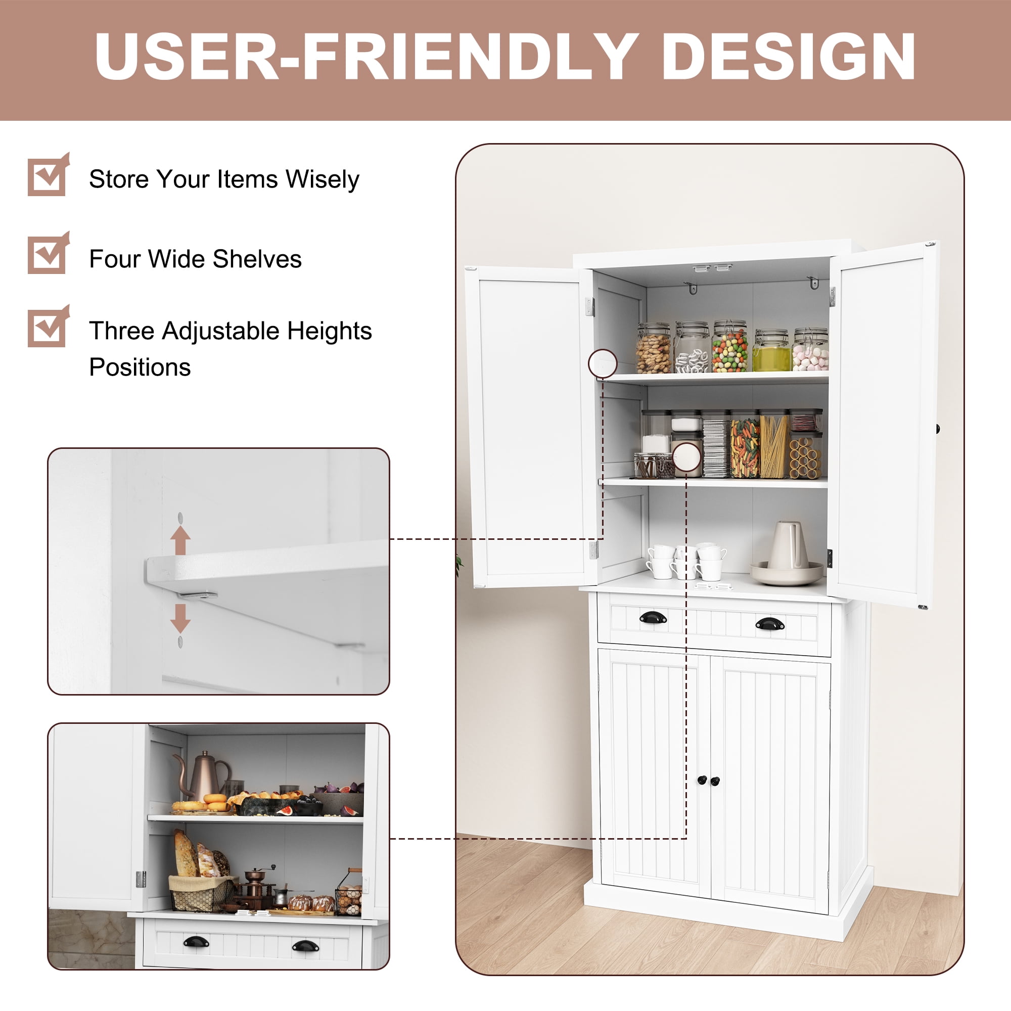 “HLR 72″” Tall Kitchen Pantry Storage Cabinet with Adjustable Shelves and Drawer, White”