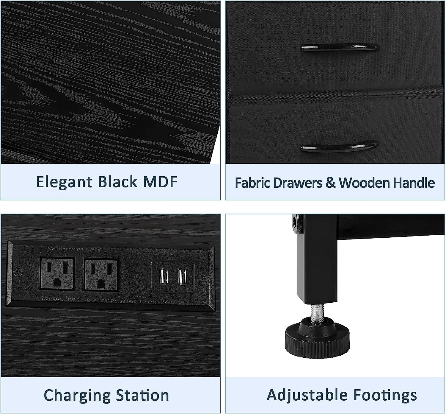 Black Nightstand with 2 Fabric Drawers End Table with Charging Station