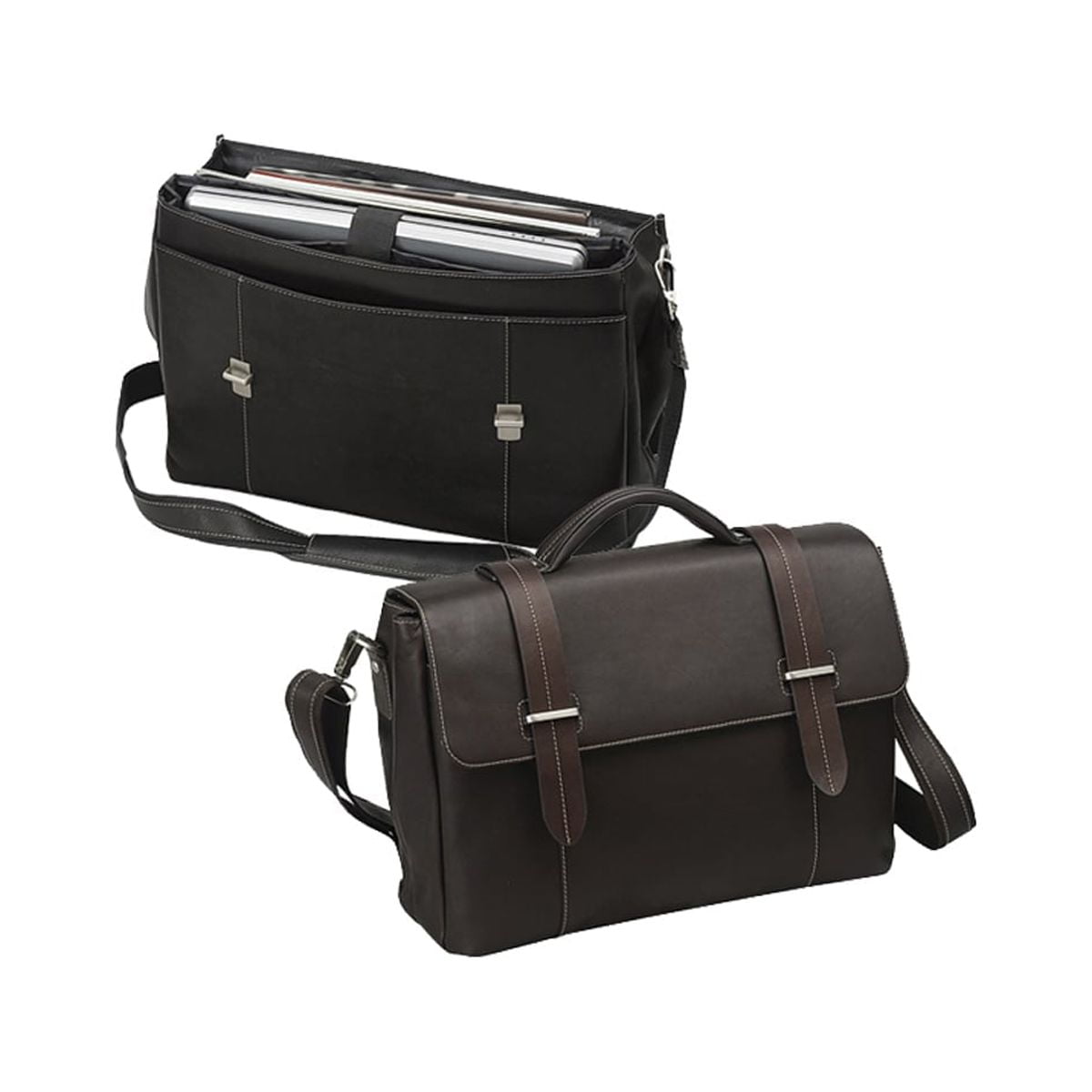 $103.20The Flap-Over Leather Computer Briefcase is made of rich Columbian leather, and features a contrast saddle stitch and brushed metal fixtures that give it a luxurious look. This brief features an open pocket with a full organizer, and three interior compartments, with a full sized zippered pocket in the middle. There is a removable bubble foam padded sleeve for a 15.4″ computer. Carry this briefcase with its leather wrapped handle or adjustable, removable shoulder strap.