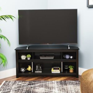 $107.50The black wood grain and simple lines on this tv stand make it look classic and elegant. It can be not only used as televison stands, also perfect for sofa table, entertainment center, media stand, storage console table, tv console etc. This TV stand is perfect for TVs up to 75 inch TV.6 open shelves with big capacity allow you to storage the books, magazines, CDs and any other media or gaming devices. The media console table made of high quality MDF which is durable and sturdy enough to be used for a long time. Plus, four wooden legs further enhance stability, preventing the TV stand from wobbling. Max load capacity: 260 lbs. The black entertainmen center for 75 inch tv with smooth surface is waterproof and easy to keep clean with a damp cloth. The tv table is 3.9 in high height off the ground which adequate for robot vacuum cleaner can passing freely. No more headaches from dust under the cabinet.