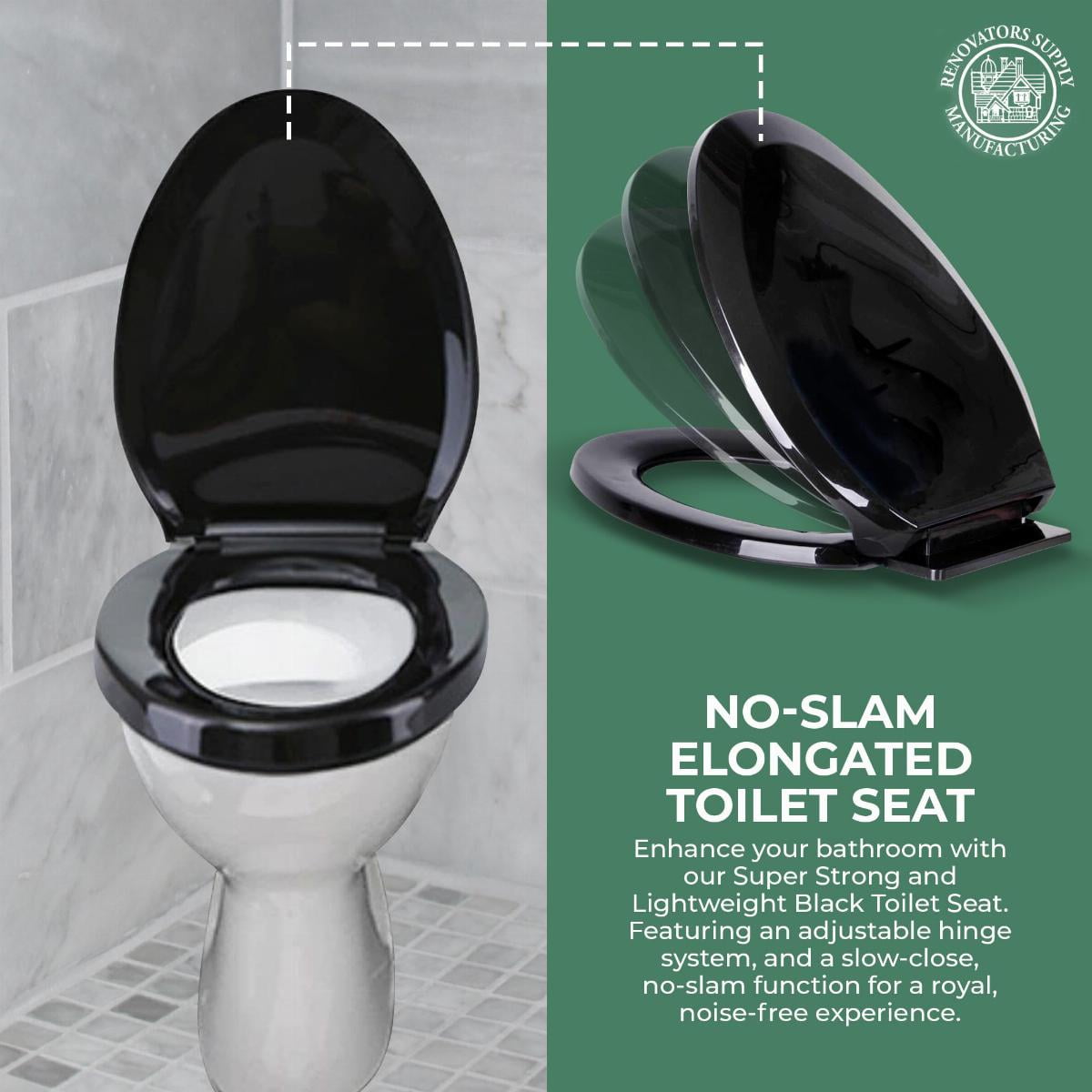 $46.43BLACK NO SLAM SLOW CLOSE ELONGATED TOILET SEATS Whether small or large – your bathroom must be comfortable, fulfill its function and relaxing, because here you start and finish every day. Our Ergonomic Design Brings You an Extraordinary Comfort Experience – Quiet-Close Elongated toilet Seat with Durable Material. Made from durable polypropylene plastic with a high gloss finish that won’t crack or peel. Its no-slip black bumpers won’t fall off easily and keep the seat in place. FEATURES – Black colored Durable High Impact plastic resists staining and cracking – Slow closing toilet seat hinge system for a soft close toilet seat lid – Oval toilet seat lid measures 17 1/4 Inches long and 13 3/4 inches wide – Toilet Seat with Quite, Safe and Slow Shut Lid – The Adjustable hinge fits standard hole spacing of 4 to 6 1/2 in. – An Additional front-to-back fine tune adjustment of 1/4 in. – Easy-clean hinges for hassle-free cleaning – Corrosion free hardware KNOW YOUR TOILET BOWL TYPE BEFORE MAKING YOUR ORDER Generally, toilet bowls come in two different sizes – Round and Elongated. Measure from the toilet seat bolt holes to the tip of the bowl to know your toilet bowl size. Standard measure: Round Bowl’s Standard measure = 16-16.5 inches Elongated Bowl’s Standard measure= 18-18.5 inches MAINTENANCE Seats are easy to install with conventional tools, all hardware included. It is recommended toilet seats be cleaned with a damp cloth and mild soap. High quality products made by Renovators Supply Manufacturing
