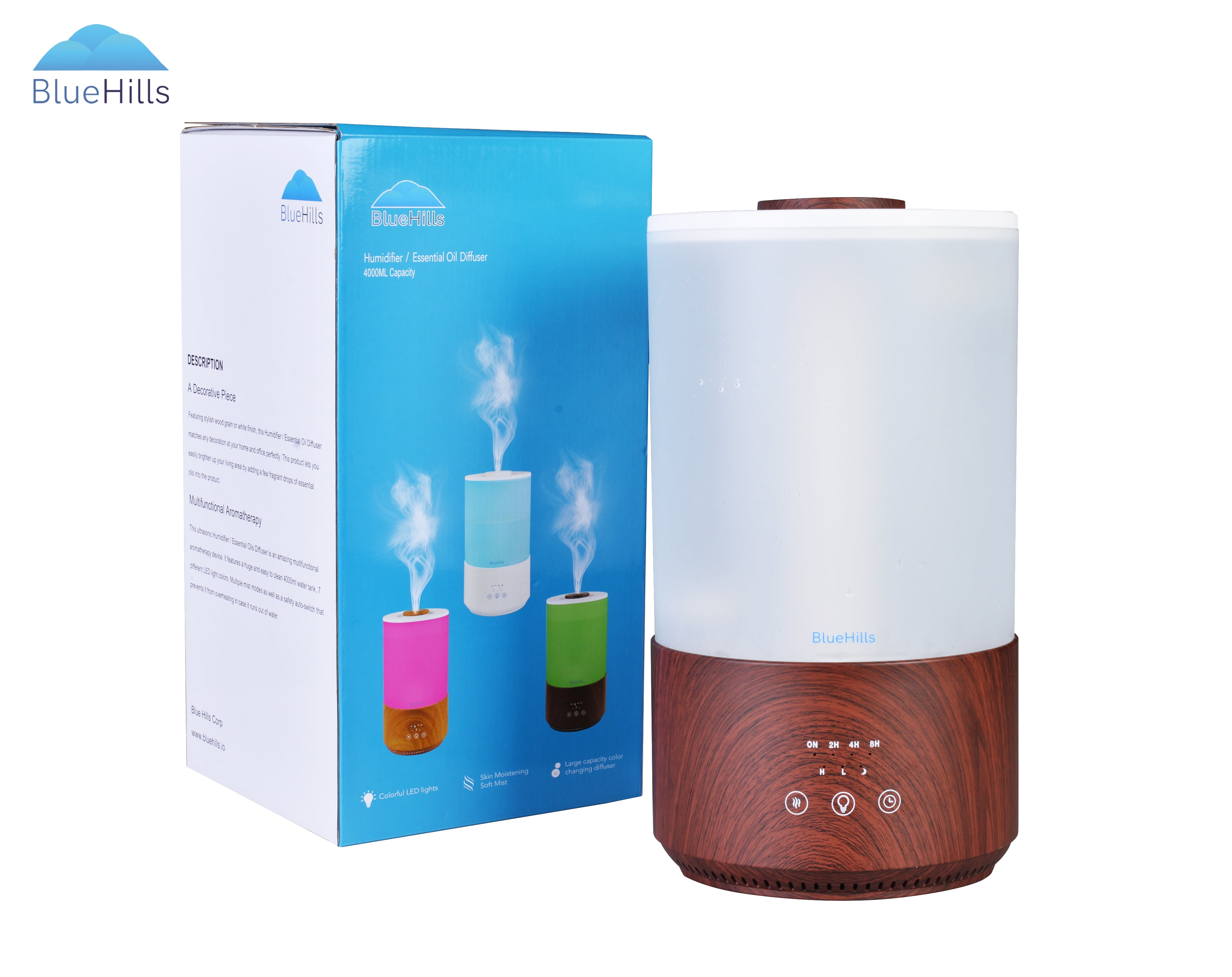 BlueHills Premium 4000 ml Tall Essential Oil Diffuser 4L 4 Liter 50 Hour Run with Remote Timer Aroma Humidifier 1 Gallon Big Capacity High Mist Output for Large Room Lights Dark Wood Grain XL T402