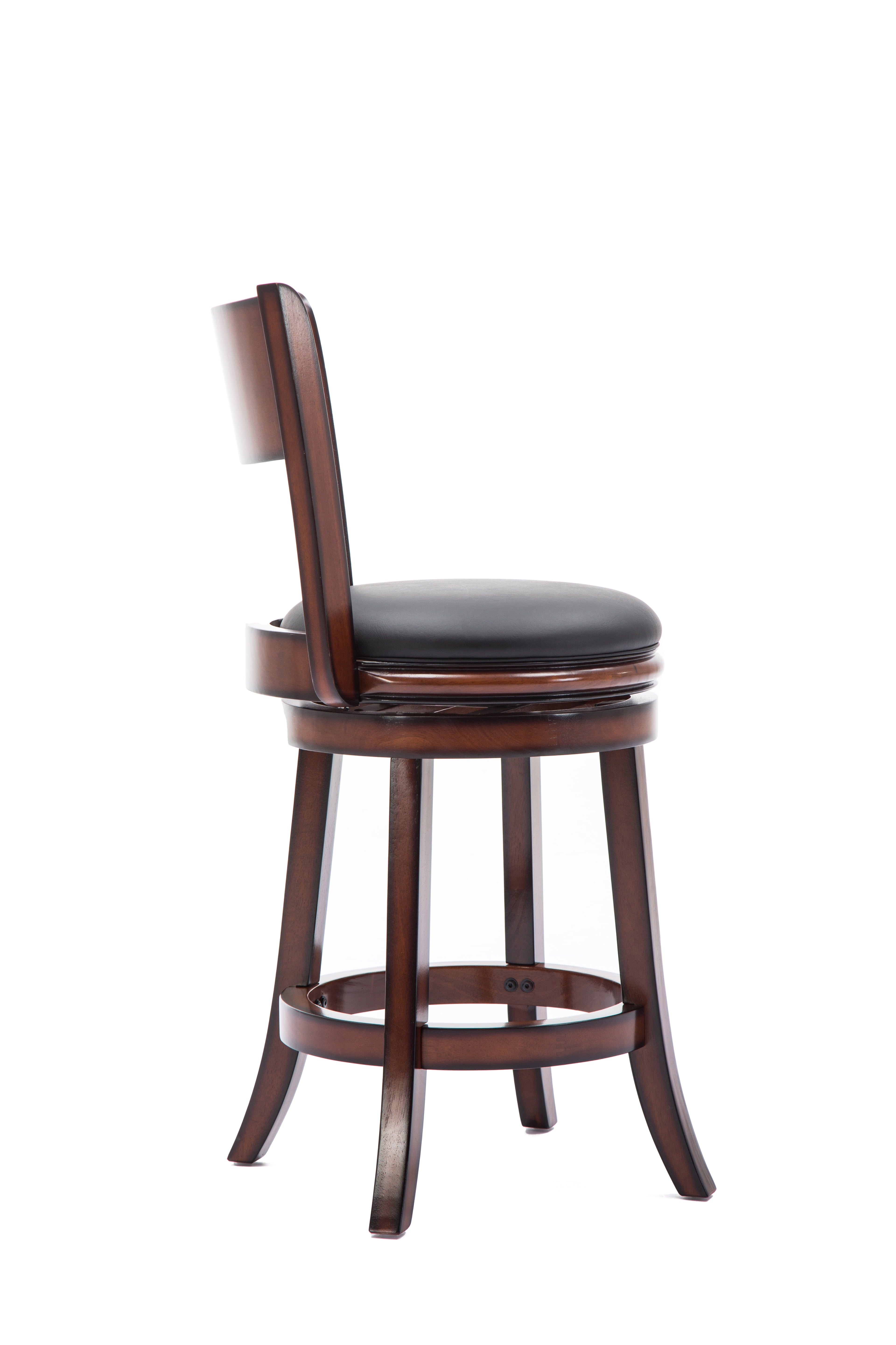 $102.92Add additional seating and an extra touch of style to your kitchen, dining room or bar with the Palmetto Swivel Counter Height Stool. It is made of solid fruitwood to ensure long-lasting durability. Black faux leather covers high-density foam, and that it easily blends in with all types of home decor. The wooden swivel stool turns a full 360 degrees, due to the durable ball bearing design. It is a versatile piece that can be placed just about anywhere. There’s no wobble with this 24″ swivel stool, fruitwood, as it features flared legs and a footrest for superior comfort and stability. Designed for use in your kitchen, dining room or game area, it is also a good choice for breakfast nooks, islands and bars. Whether it is just a casual family dinner or a party for family and friends, the wooden swivel stool brings both extra seating and extra style any room in your home.