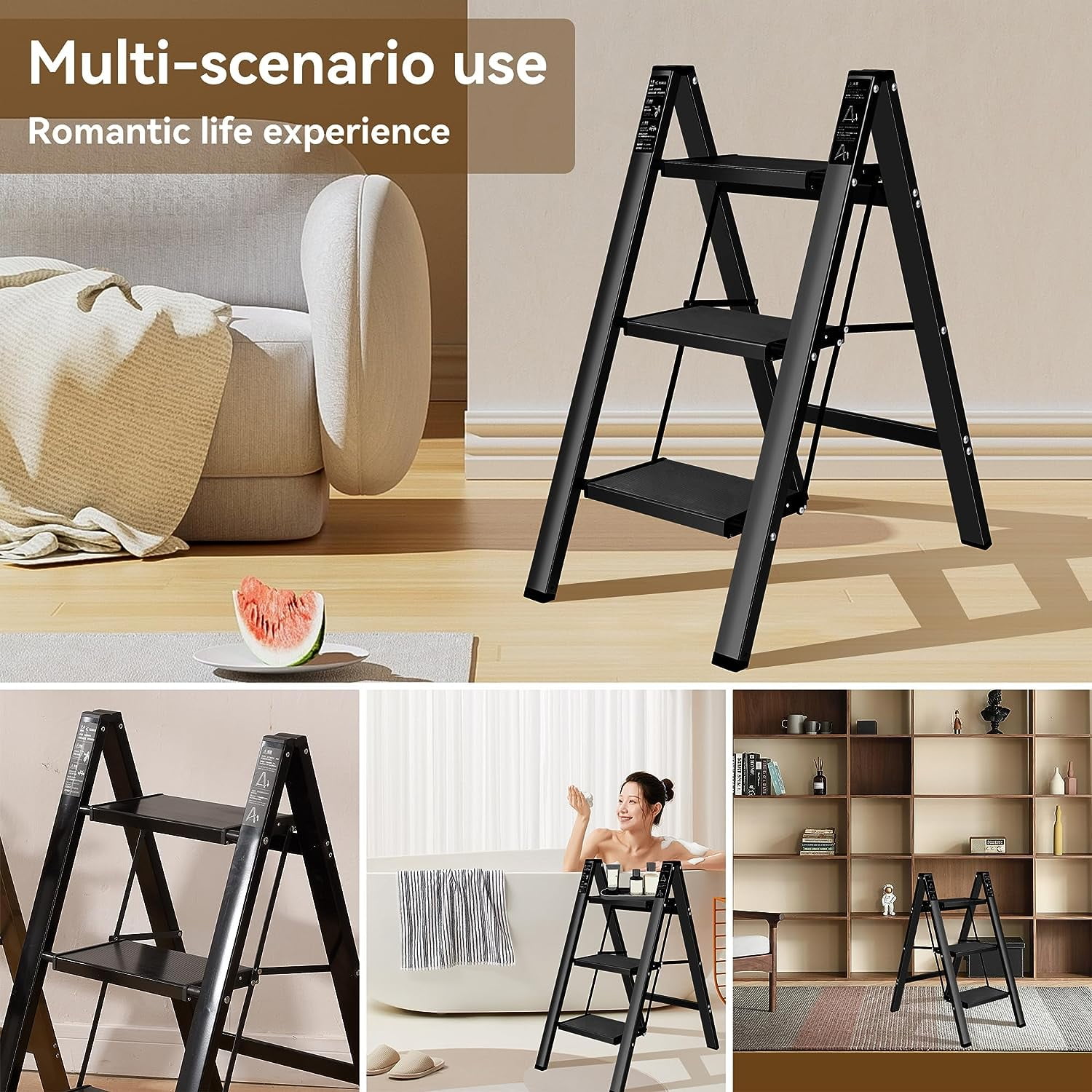$42.99Lightweight Compact Ladder – Fold thin to 2.1 inches. Easy to store behind a door, under sofas, in the closet, and accessible for use.Sturdy Aluminum Step Ladder – Made of aircraft-grade aluminum, the ladder is lighter and the weight capacity is up to 330 pounds. The embedded beams between the frame ensure that the ladder will not shake and triangular structure support is stable when you climb the ladder.Non-slip Treads and Feet – Your feet are relaxed when stepping on the rungs. The rubber feet are also anti-slip processed, suitable for kinds of floors, and prevent scratches.Free of Installation – Comes fully assembled. Quickly open and fold in secs. Easy to climb as going up the stairs. You can easily reach the high place now.