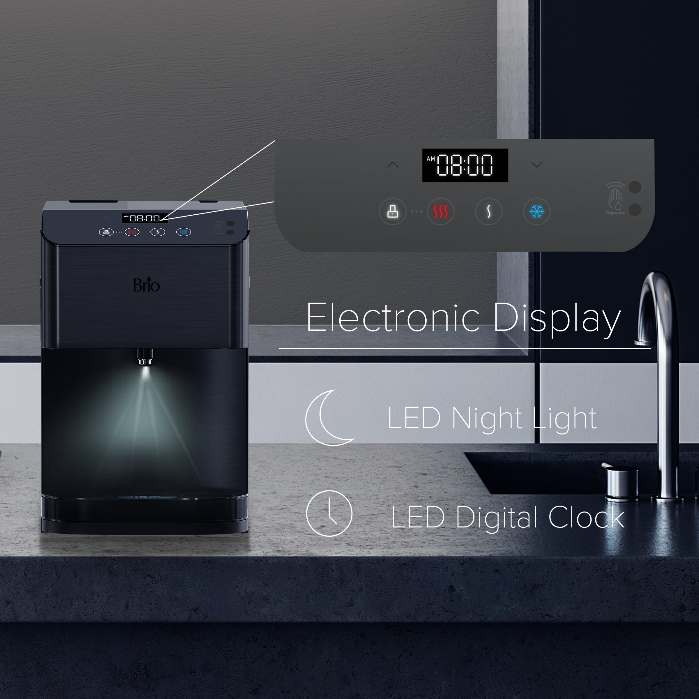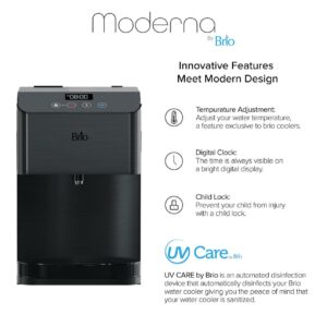 $248.11Revitalize with clean water from the Brio 700 series Moderna touch less countertop water cooler dispenser. Simply wave your hand in front of the digital control panel to activate the single-sensor technology to dispense crisp water. Experience hydration like never before with this 3-stage point of use bottleless water cooler. Say goodbye to lifting heavy bottles and trips to the store as this point of use water cooler uses the industry’s most innovative P.O.U. Filtration technology. The 3-step filtration system thoroughly purifies water, removing dust, particles and rust which greatly improves the taste of your water. Brio delivers only the finest and purest water in your cup, so enjoy refreshing cool water as low as 39 degrees, soothing hot water up to 194 degrees and room temperature water at any time. Always have perfectly cool or hot water on hand with the cooler that goes above and beyond. Enjoy all the benefits of a powerful point of use bottleless cooler with the simplest maintenance. Built with you in mind, this cooler features a child-safety lock to protect tiny hands from scalding water. The illuminated display panel allows you to control the water temperature, clock and nightlight. Trust in a water system that leads in innovation and health.