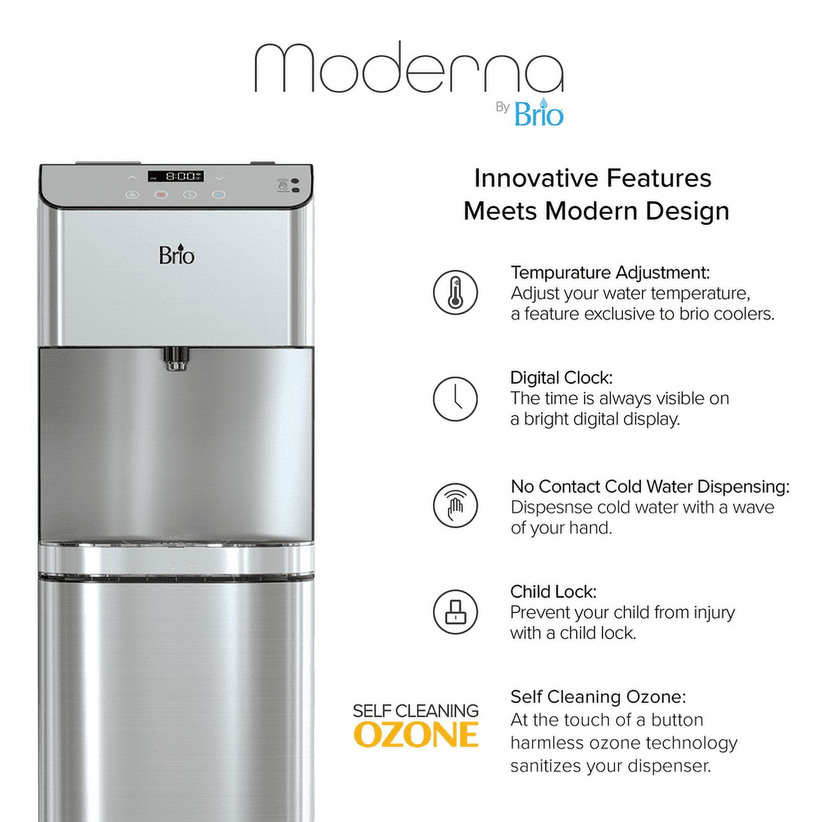 $343.99Revitalize with clean water from the Brio 700 Series moderna touchless bottom loading 3-5 gallon capacity water cooler dispenser with custom setting tri-temperature 39-59 Degrees cold, 174–194 degrees hot and room temperature. Refueling with fresh, clarified water has never been easier; simply wave your hand in front of the digital control panel to activate the single-sensor technology to dispense crisp water. Dispensing water has never been more convenient and sanitary. Tuck away undesirable water bottles with the lower cabinet storage. Replacing bulky water bottles has transformed into an effortless and hassle-free process with this feature. The illuminated display panel allows you to control water temperature, a clock, nightlight, and child lock to ensure everyone’s safety while utilizing the Brio Moderna. Trust in a water system that leads in innovation and health.