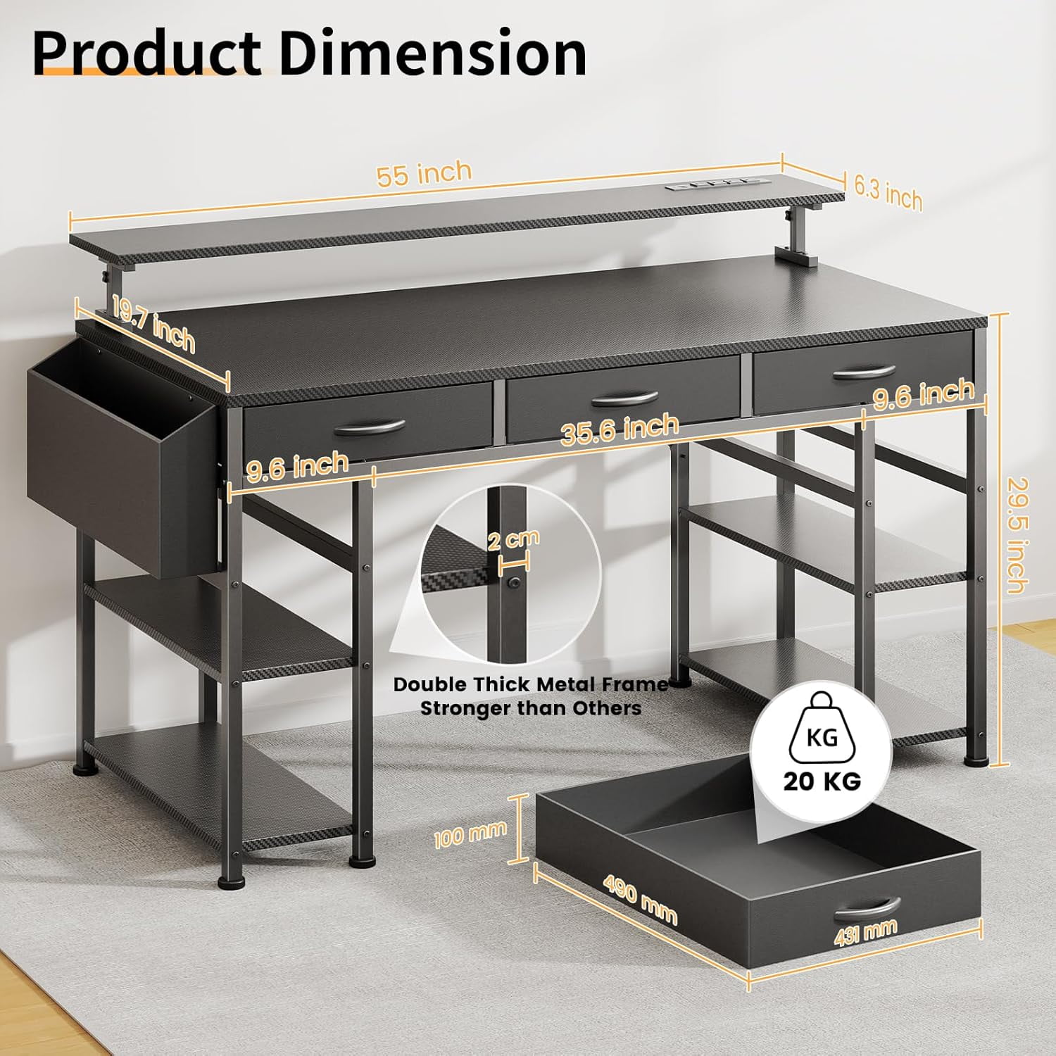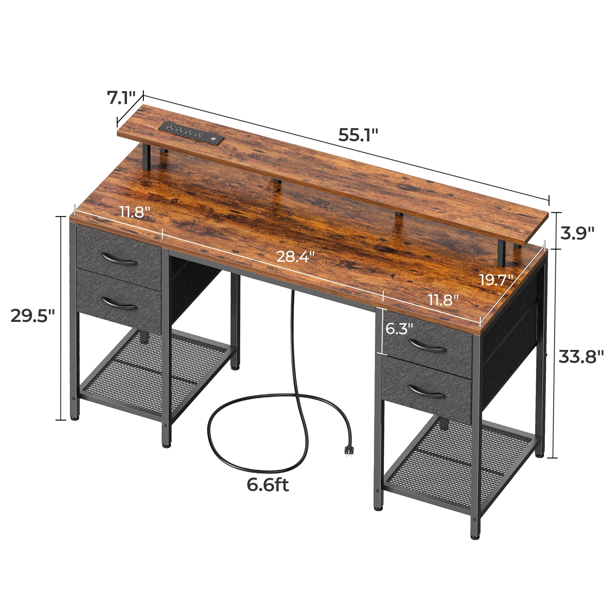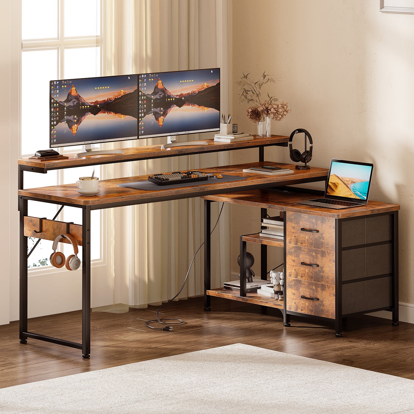 $137.59【Reversible Design & USB Charging Ports】 This Computer desk equipped with two standard plug outlets and two USB ports, this desk allows you to easily charge your phones, laptops, gaming gear, and other office devices. And it can be installed in four different configurations – as an L-shaped desk or a long desk with the side desk on the left or right side. Customize it to suit your habits and needs, providing convenience while working or gaming. 【Health-friendly Monitor Stand Design】 Monitor stand’s size enough for two monitors at the same level, not only elevates your line of sight, allowing you to maintain proper sitting posture and protect your cervical and spinal health, but also creates additional storage space on the desktop for keyboards, mice, and more. 【Home Desk with Drawers and Shelves】 With two tiers of open shelves, this desk provides storage for various items, including computer hosts, books, and small devices. Three fabric drawers, along with a wooden board, offer privacy and ample space for office stationery and documents. Two versatile hooks are perfect for hanging headphones, bags, and other useful gadgets, keeping everything easily accessible and organized. 【Sturdy and Solid Desk for Multiple Scenes】 Constructed with a premium metal frame and high-quality MDF board, this desk ensures stability, durability, and resistance to scratches and water damage. Suitable for various scenes, including a computer desk, study desk, gaming desk, office table, work desk, home desk, and workstation, providing a versatile solution for all your needs.